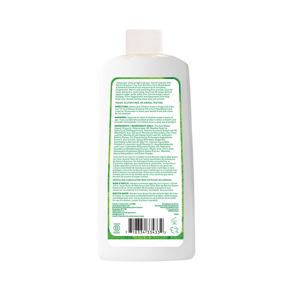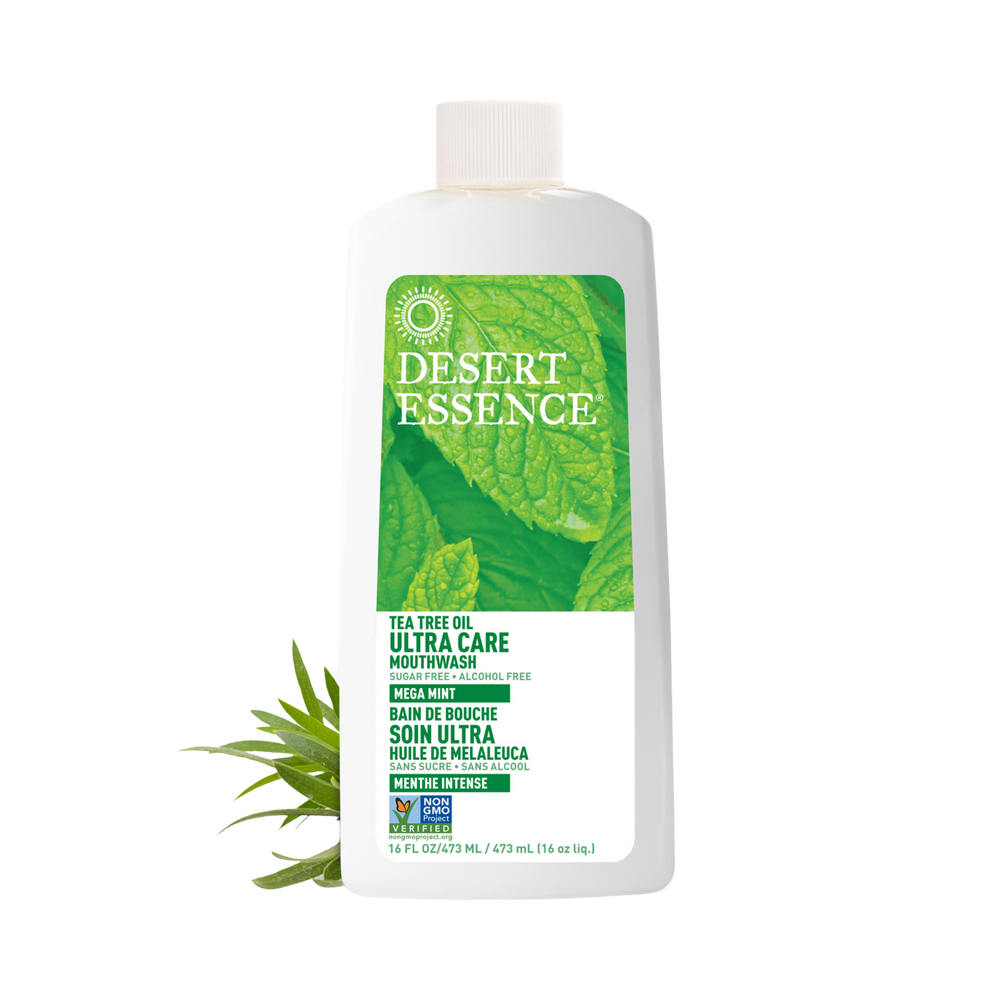 Sugar and alcohol-free tea tree oil mouthwash formulated with Pure Australian Eco-Harvest® Tea Tree Oil, soothing Chamomile and Myrrh. Provides care for teeth and gums, while freshening breath with a mega-dose of Mint.