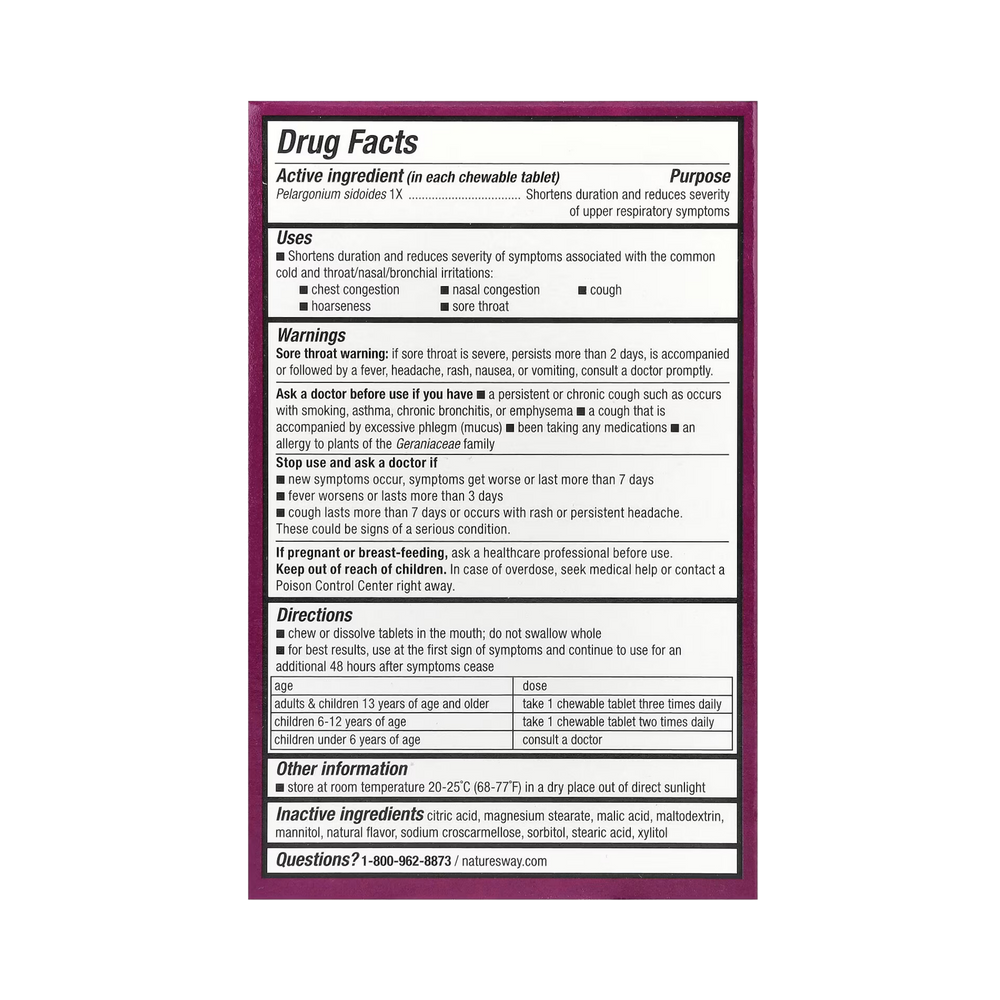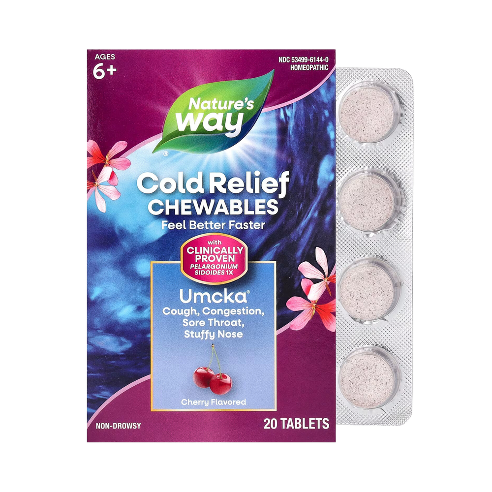 This supremely powerful chewables are the perfect help for nasal and bronchial irritations, congestion, sore throat, and cough. Nature's Way, Umcka ColdCare Chewables are clinically proven to shorten the duration and reduce the severity of cough, congestion, sore throat, and nasal and bronchial irritations. These convenient yet delicious chewable tablets are non-drowsy.