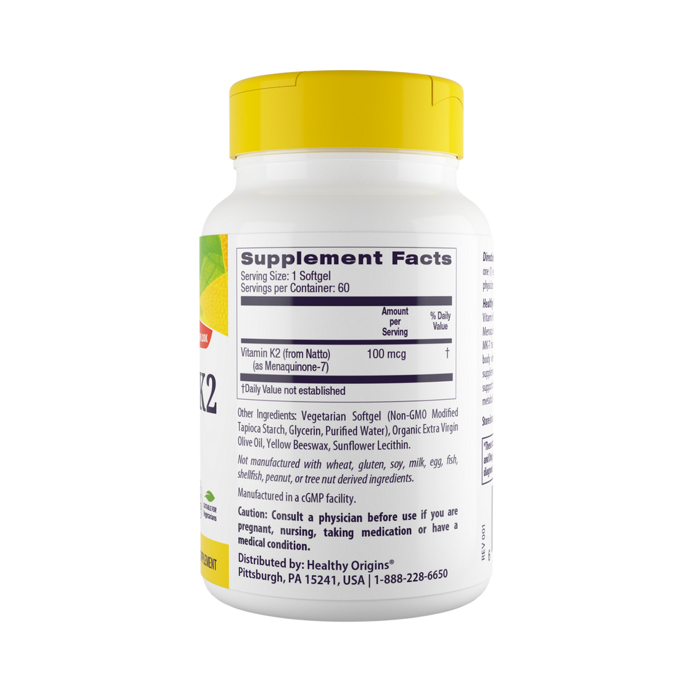 Healthy Origins Natural Vitamin K2 (from Natto) provides Vitamin K2 in its most biologically active form called Menaquinone-7 or MK-7 for short. Vitamin K2 as MK-7 has superior absorption and retention in the body when compared to Vitamin K1- the typical supplemental form. Natural Vitamin K2 may help to support bone health, cardiovascular health, calcium metabolism and arterial health.