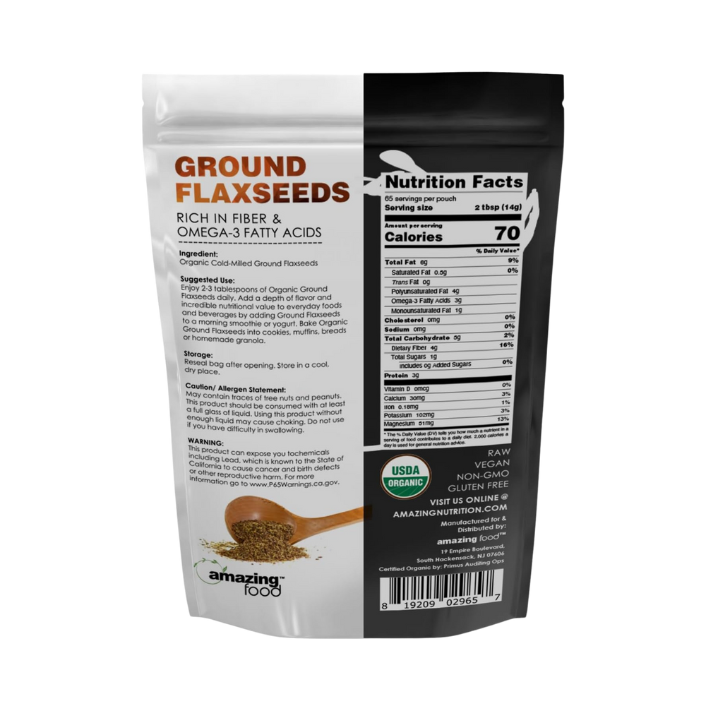 - 14 Grams Per Serving Organic Cold- Milled Ground Flaxseeds - 64 Servings Per Pouch, 2 Tbsp (14 G) Per Serving - USDA Organic, Vegan, Non-GMO, Gluten Free - Manufactured in accordance with GMP Standards, Third Party Tested - Proudly made in the USA with Guaranteed Purity & Potency