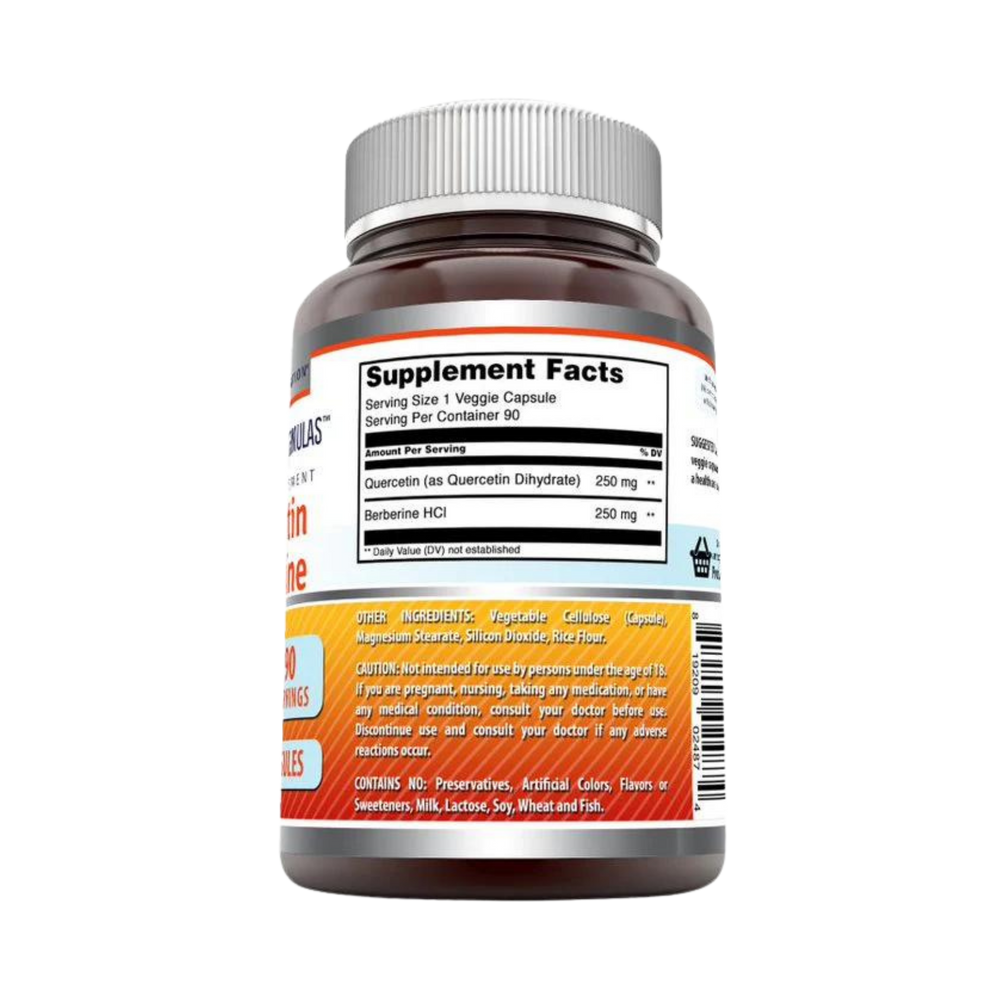 Each veggie capsule of Amazing Formulas Quercetin Berberine dietary supplement provide 250 milligrams of Quercetin and 250 milligrams of Berberine.