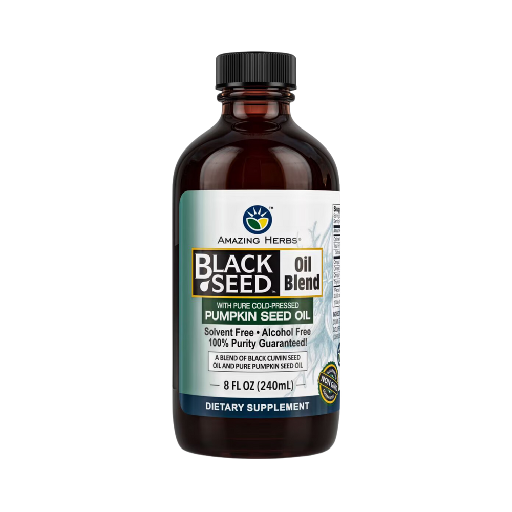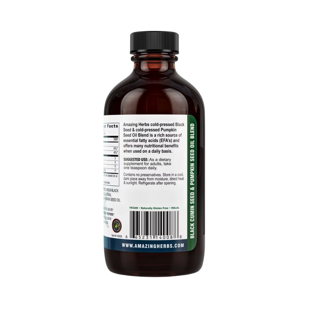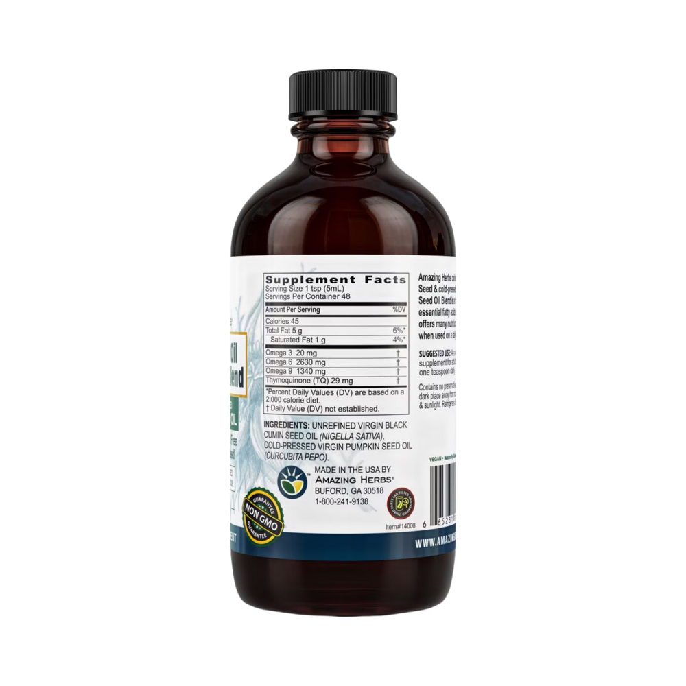 Amazing Herbs cold-pressed Black Seed & cold-pressed Pumpkin Seed Oil Blend is a rich source of essential fatty acids (EFA's) and offers many nutritional benefits when used on a daily basis.