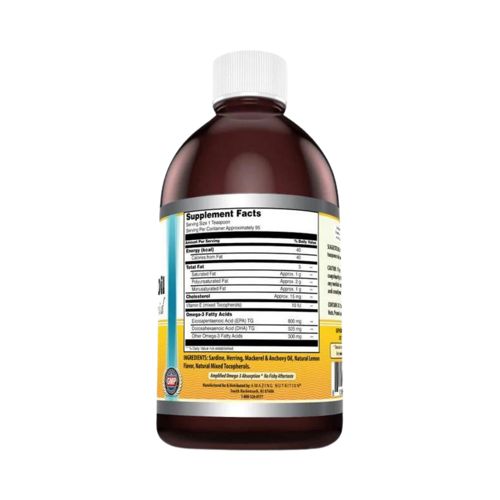 Every 1 tsp serving of Amazing Omega Norwegian Fish oil dietary supplement contains 1000 mg of pure Norwegian Fish oil along with 10 IU of Vitamin E (Mixed Tocopherols)