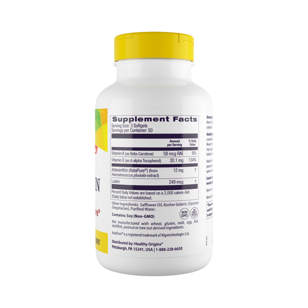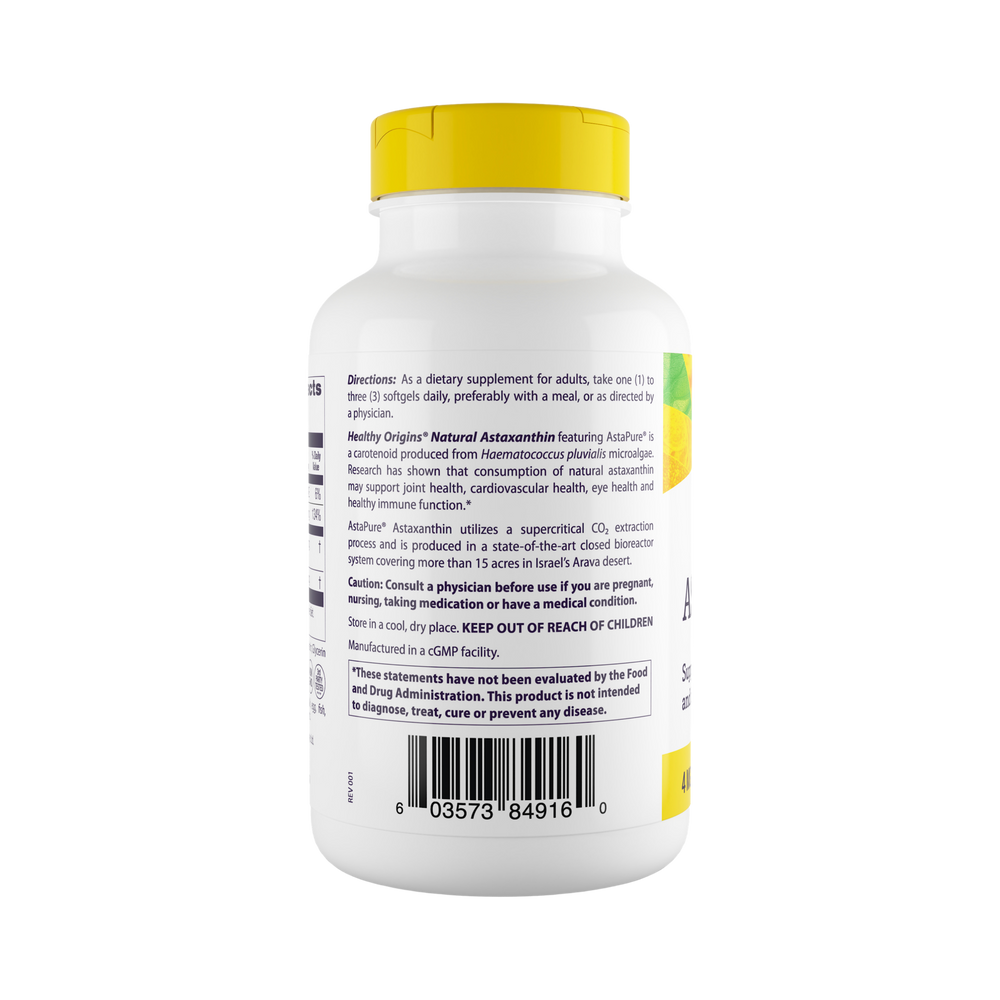 Healthy Origins® Natural Astaxanthin featuring AstaPure® Natural Astaxanthin is a carotenoid produced from Haematococcus pluvialis microalgae. Research has shown that consumption of natural astaxanthin may support joint health, cardiovascular health, eye health and healthy immune function. AstaPure® Astaxanthin utilizes a supercritical CO2 extraction process and is produced in a state-of-the-art closed bioreactor system covering more than 15 acres in Israel’s Arava Desert.