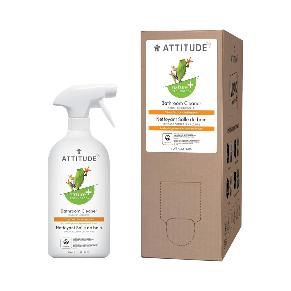 ATTITUDE Nature+TechnologyTM Bathroom Cleaner is all you need for sparkling, spotless surfaces! Formulated with plant- and mineral-based ingredients like saponin, green tea extract, and a natural citrus zest fragrance to deodorize your bathroom. Its powerful combination makes it impossible for limescale or soap scum to fester on tiles, shower curtains countertops & toilet bowls - leaving only cleanliness behind!