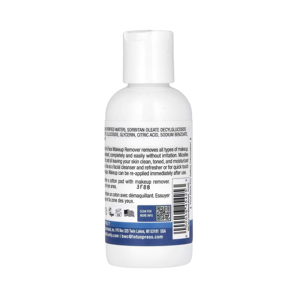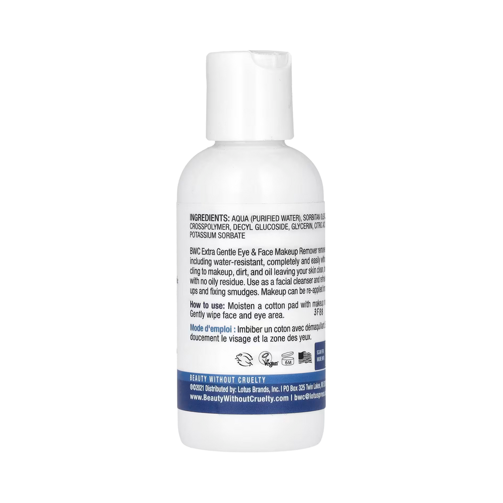 BWC Extra Gentle Eye & Face Makeup Remover removes all types of makeup, including water-resistant, completely and easily without irritation. Micelles cling to makeup, dirt, and oil leaving your skin clean, toned, and moisturized with no oily residue. Use as a facial cleanser and refresher or for quick touch ups and fixing smudges. Makeup can be re-applied immediately after use.