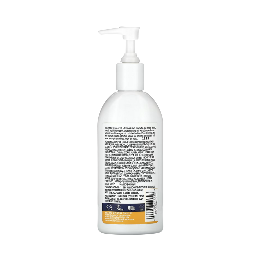 BWC Vitamin C Hand & Body Lotion moisturizes, rejuvenates, and protects for soft, smooth, youthful-looking skin. Active antioxidants help your skin respond to sun and environmental damage to look radiant and revitalized. Select botanicals and pure premium essential oils nurture, balance, and tone while rich emollients and humectants replenish moisture, soothe and protect.