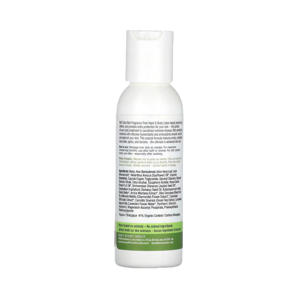 BWC Extra Rich Fragrance Free Hand & Body Lotion deeply moisturizes, softens, and provides extra protection for your skin -- the perfect all-over body treatment to counteract extreme dryness. Rich emollients, combined with effective humectants and antioxidants smooth, nourish and replenish your skin. This special formula features arnica, calendula, shea butter, jojoba, and tamanu - the ultimate in advanced skin care.
