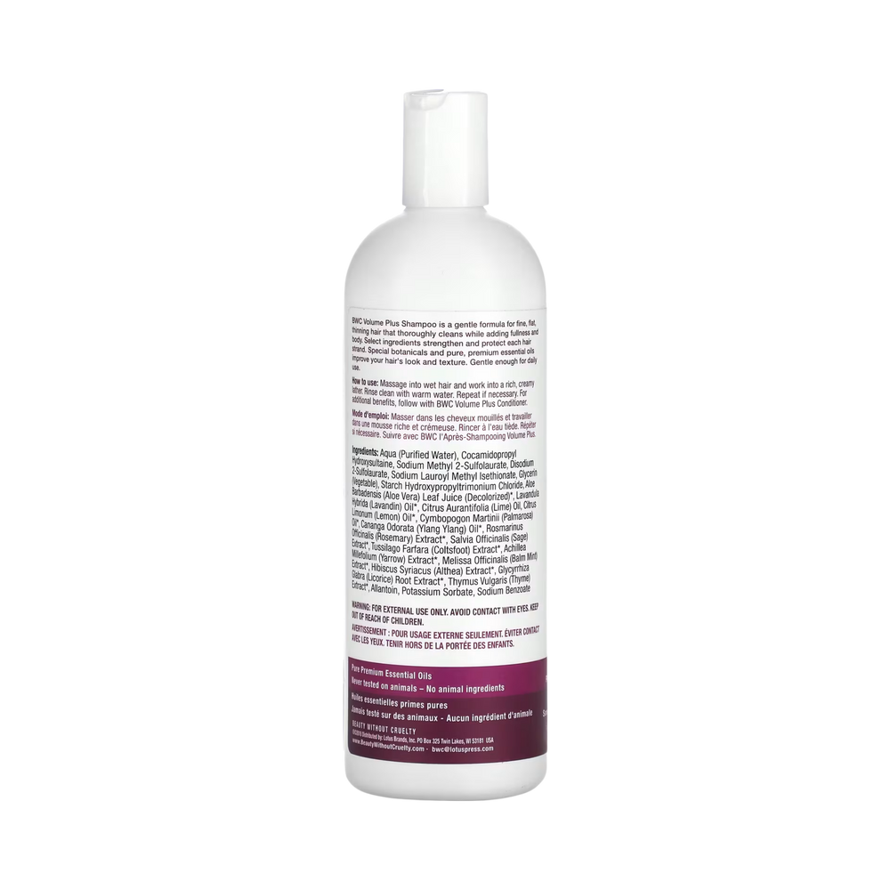 BWC Volume Plus Shampoo is a gentle formula for fine, flat, thinning hair that thoroughly cleans while adding fullness and body. Select ingredients strengthen and protect each hair strand. Special botanicals and pure, premium essential oils improve your hair's look and texture. Gentle enough for daily use.