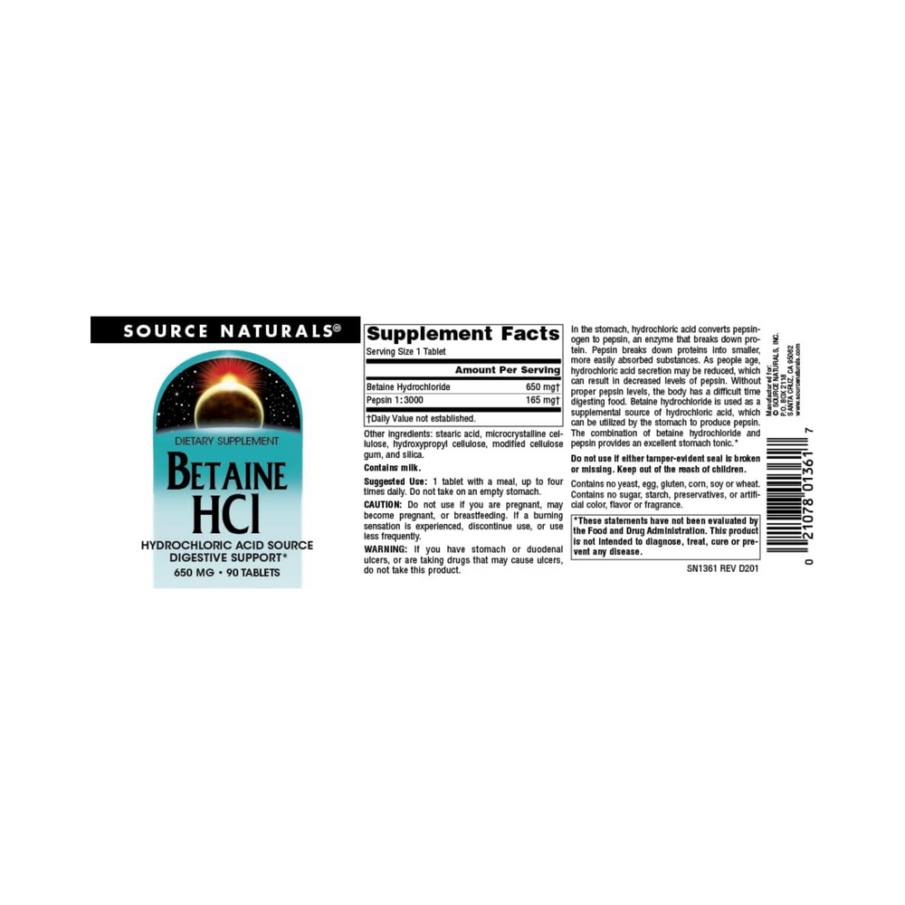 Source Naturals, Betaine HCl, 650 Mg, 90 Tablets