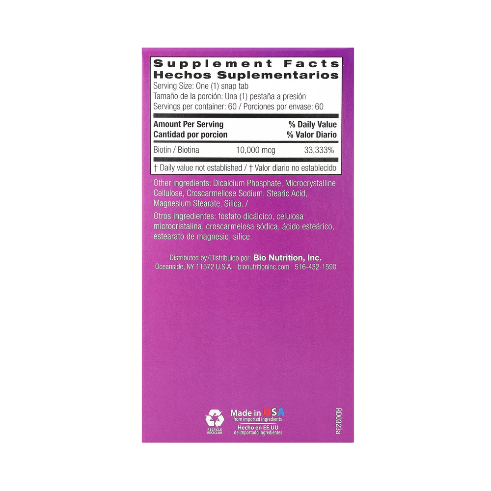 Bio Nutrition, Biotin, Maximum Strength, 10,000 Mcg, 60 Snap Tabs