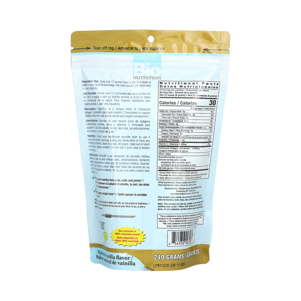 Bio Nutrition, Colla-Flex, Hydrolyzed Collagen with Boswellia, Silica & Vitamin C, Natural Vanilla, 240 g