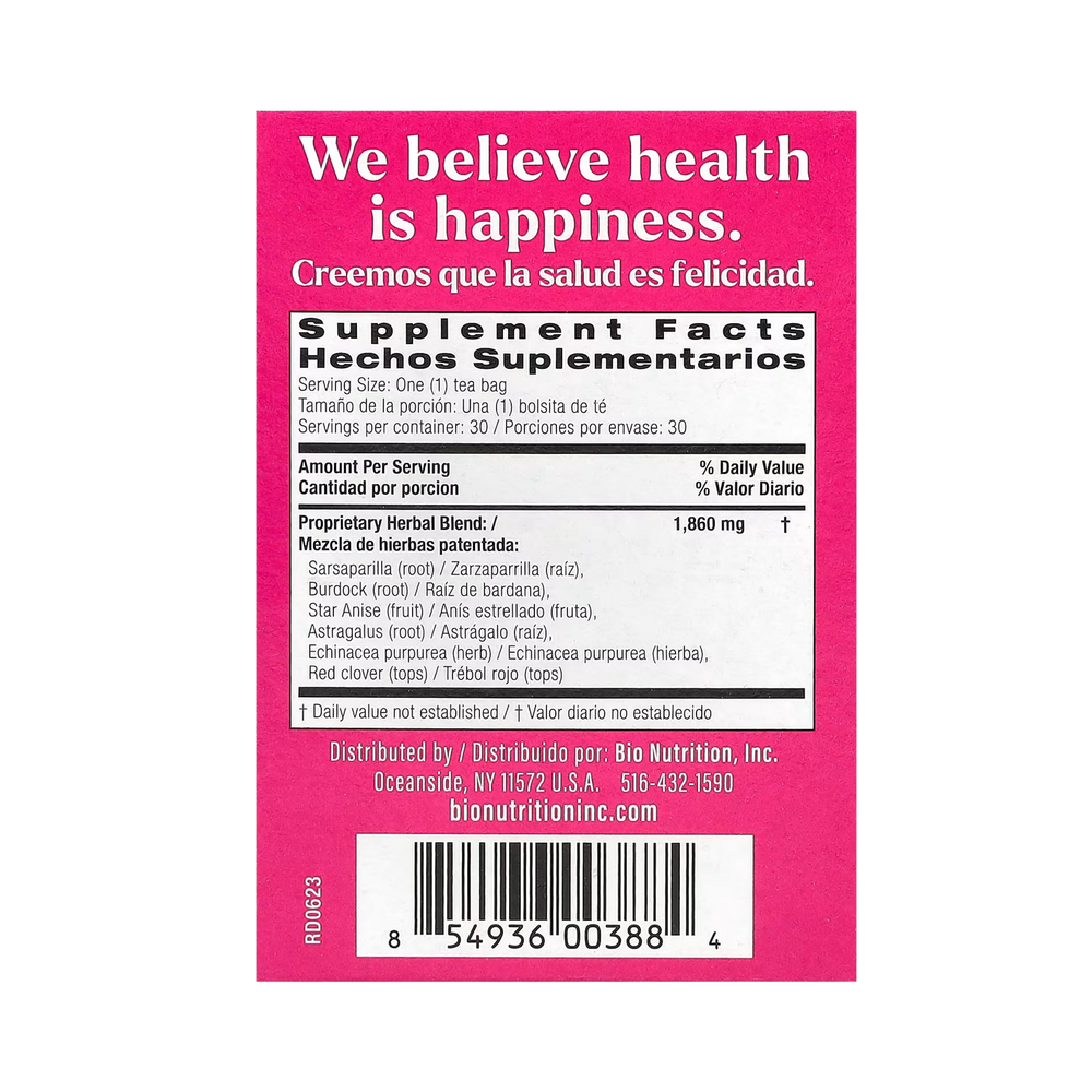 Proprietary Herbal Blend: Sarsaparilla (root), Burdock (root), Star Anise (fruit), Astragalus (root), Echinacea purpurea (herb), Red clover (tops) |