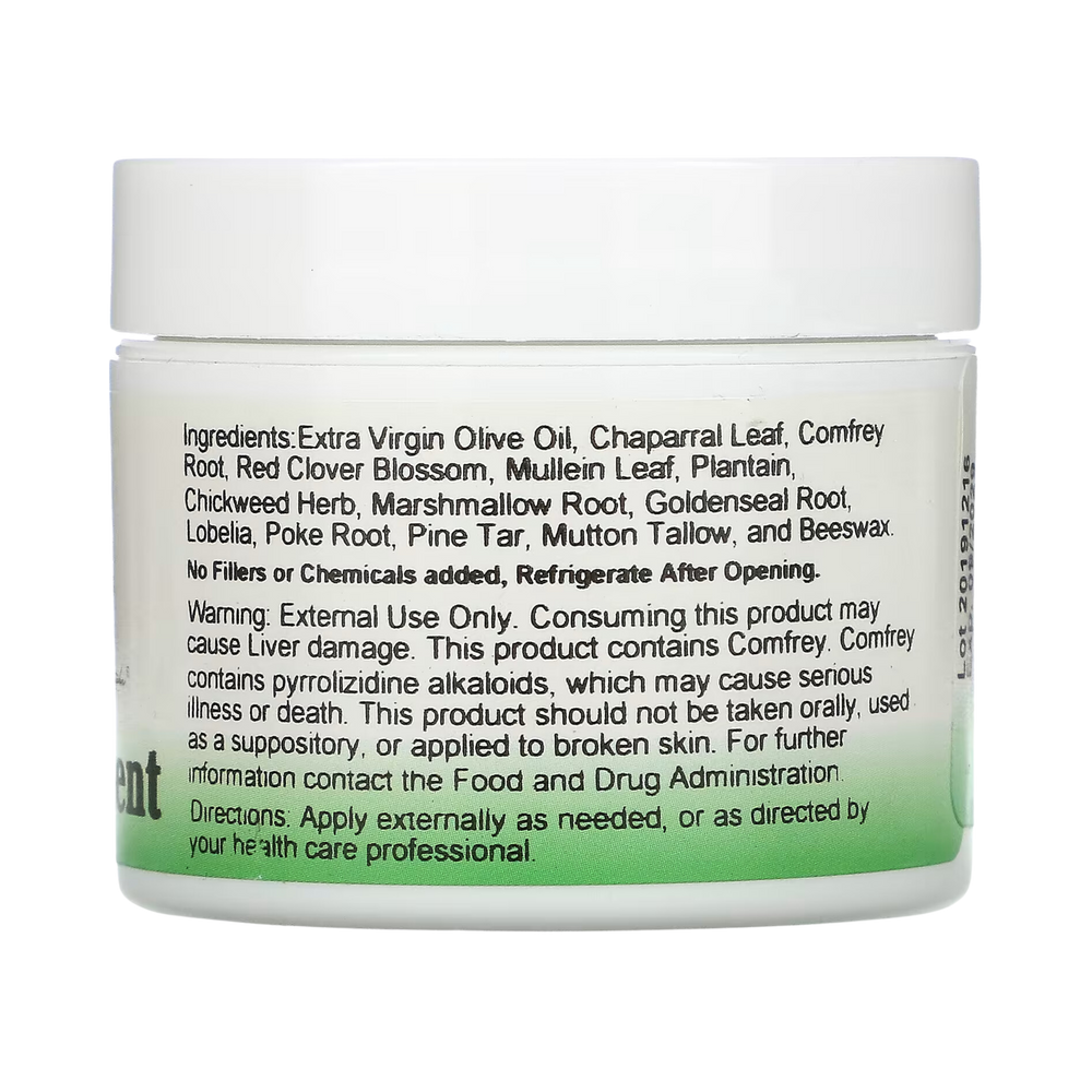 Warning: External use only. Consuming this product may cause Liver damage. This product contains comfrey. Comfrey contains pyrrolizidine alkaloids which may cause serious illness or death. This product should not be taken orally used as a suppository or applied to broken skin. For further information contact the Food & Drug Administration.