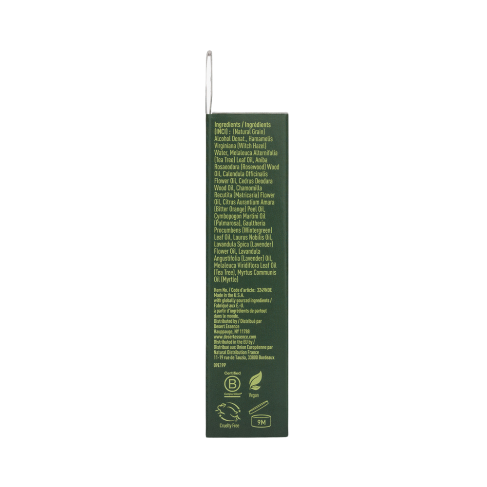 (Natural Grain) Alcohol Denat., Hamamelis Virginiana (Witch Hazel) Water, Melaleuca Alternifolia (Tea Tree) Leaf Oil, Aniba Rosaeodora (Rosewood) Wood Oil, Calendula Officinalis Flower Oil, Cedrus Deodara Wood Oil, Chamomilla Recutita (Matricaria) Flower Oil, Citrus Aurantium Amara (Bitter Orange) Peel Oil, Cymbopogon Martini Oil (Palmarosa), Gaultheria Procumbens (Wintergreen) Leaf Oil, Laurus Nobilis Oil, Lavandula Spica (Lavender) Flower Oil, Lavandula Angustifolia (Lavender) Oil, Melaleuca Viridiflora Leaf Oil (Tea Tree), Myrtus Communis Oil (Myrtle)