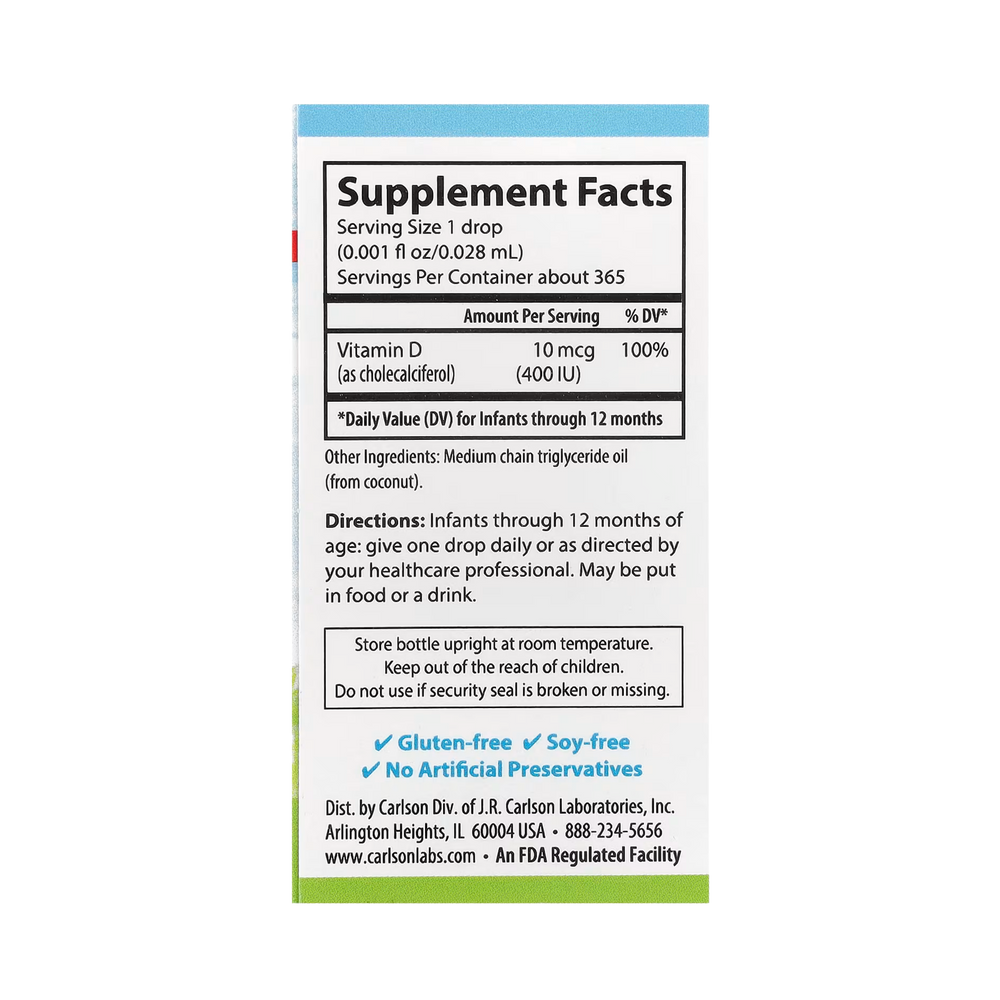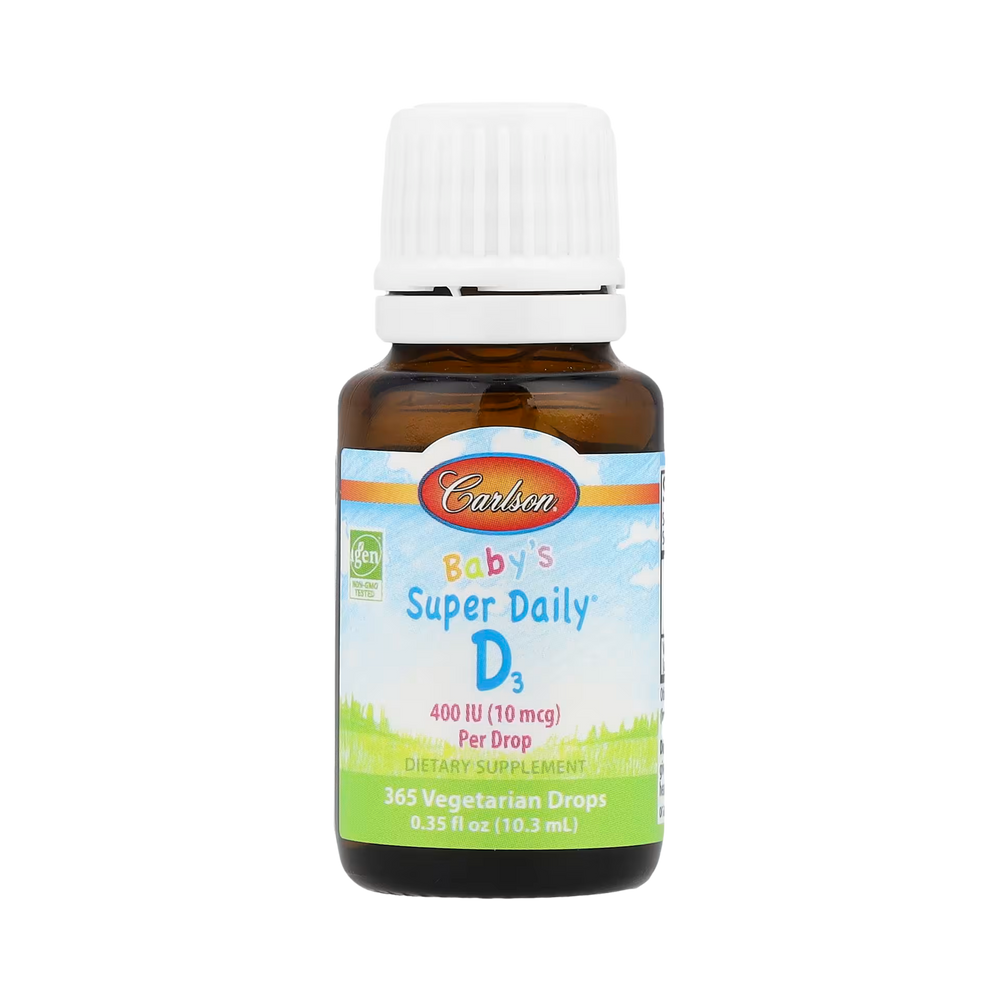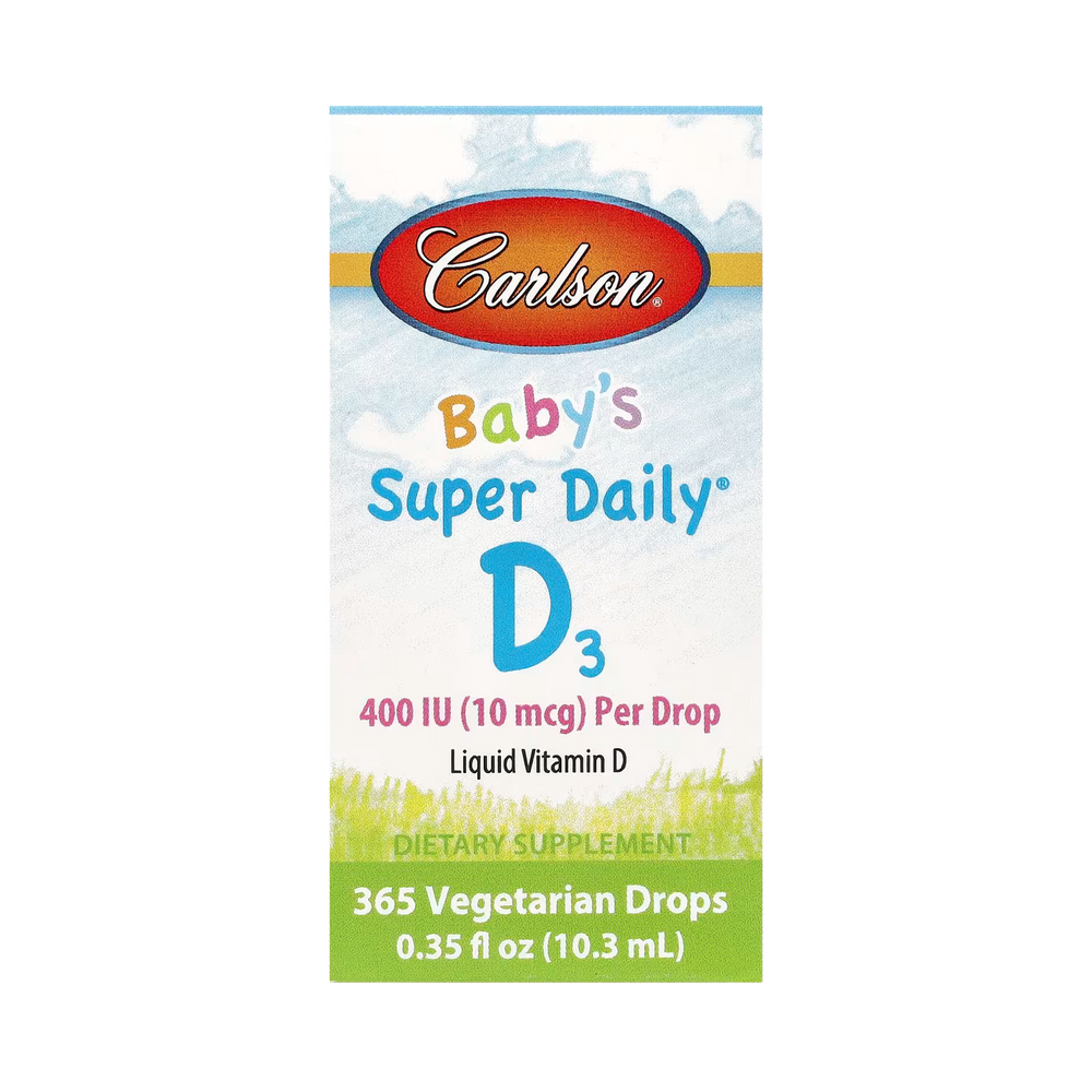 Vitamin D3 plays an important role in overall health, but not everyone gets enough from the sun. Carlson Baby’s Super Daily® D3 provides vitamin D3 in a safe and convenient way. A single drop of Carlson Baby’s Super Daily® D3 supplies 400 IU (10 mcg) of concentrated liquid vitamin D3, the recommended dose of the American Academy of Pediatrics.