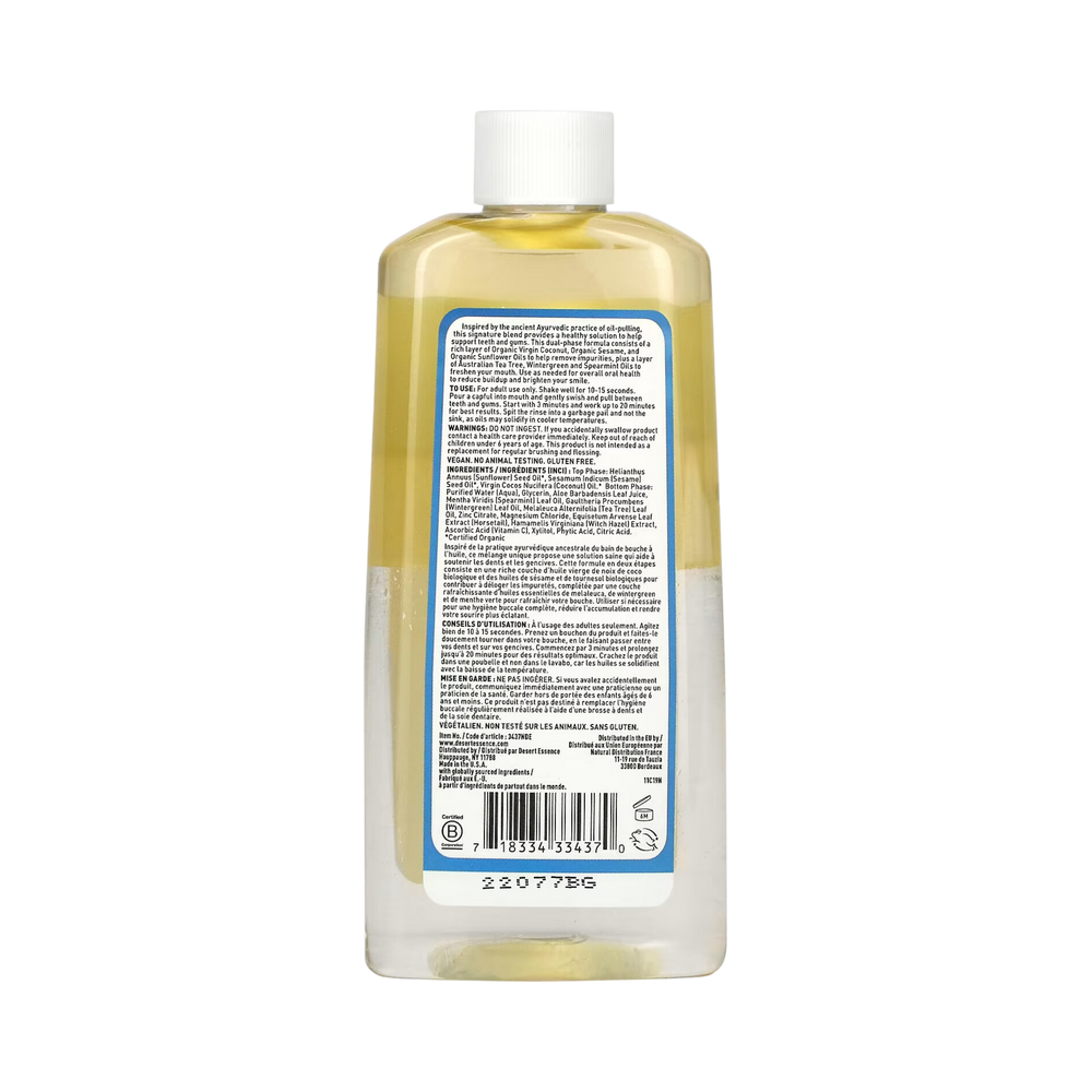 Inspired by the ancient Ayurvedic practice of oil pulling, this dual phase pulling rinse formulated with Organic Virgin Coconut Oil, Organic Sesame and Organic Sunflower Oil helps remove impurities from teeth and gums, while freshening breath with pure Australian Tea Tree, Wintergreen and Spearmint Oils.