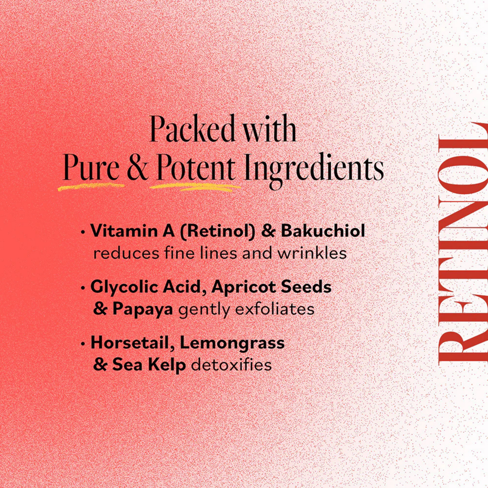Aqua, Cetyl Alcohol, Stearic Acid, Hydroxypropyl Starch Phosphate, Prunus Armeniaca (Apricot) Seed Powder, Decyl Glucoside, Polysorbate 60, Glycerin , Glyceryl Stearate SE, Cetearyl Alcohol, Xanthan Gum, Bakuchiol, Retinol, Glycolic Acid, Carica Papaya (Papaya) Fruit Extract, Ascorbyl Palmitate , Tocopheryl Acetate, Panthenol , Equisetum Arvense (Horsetail) Extract, Macrocystis Pyrifera (Sea Kelp) Extract, Organic Calendula Officinalis Flower Extract*, Cymbopogon Schoenanthus (Lemon Grass) Extract, Phenoxyethanol, Ethylhexylglycerin, Natural Fragrance Oils