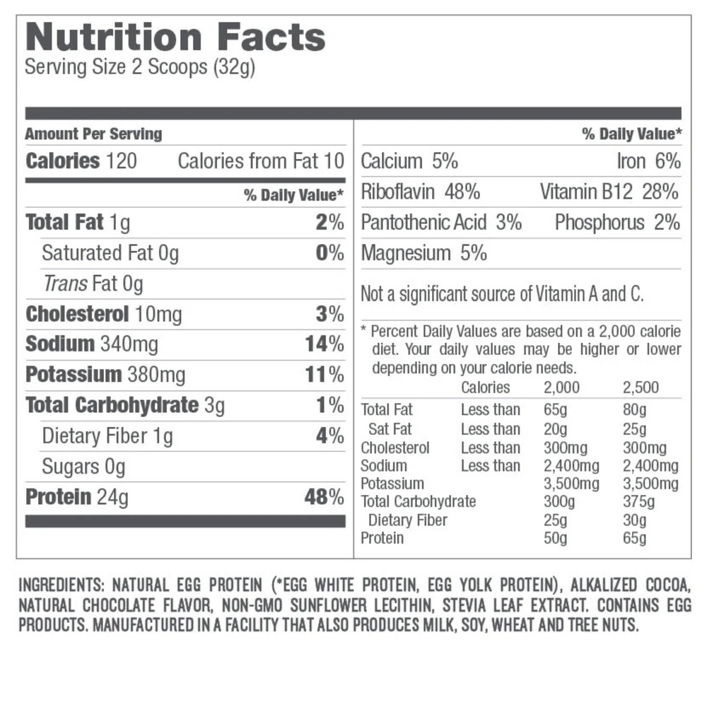 Natural egg protein (egg white protein, egg yolk protein), alkalized cocoa, natural chocolate flavor, non-gmo sunflower lecithin, stevia leaf extract.