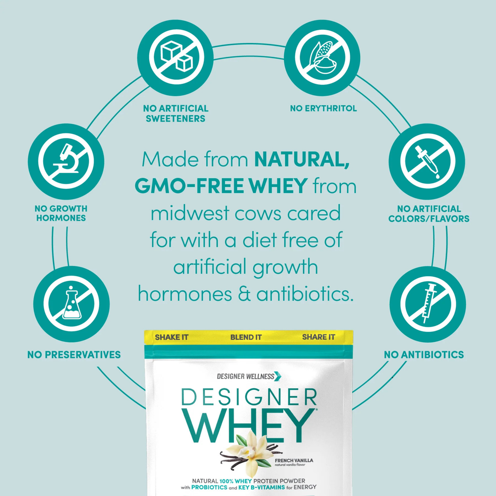 Designer whey full spectrum peptides: (GMO-free and rBGH-free whey protein concentrate, GMO-free and rGBH-free whey protein isolate, L-glutamine, L-leucine, taurine, L-phenylaline), digestive health blend: [GMO-free prebiotic vegetable fiber, probiotics: (lactobacillus acidophilus, B-longum, L-plantarum), vegetarian protease enzymes], natural vanilla flavor, electrolyte blend: (calcium phosphate, magnesium oxide), sunflower lecithin, B-vitamin blend: (calcium pantothenate, pyridoxine hydrochloride, thiamin mononitrate, riboflavin), zinc gluconate, stevia leaf extract, xanthan gum, sodium alginate, cinnamon, monk fruit, annatoo, mixed tocopherols, vitamin D3 (cholecalciferol).
