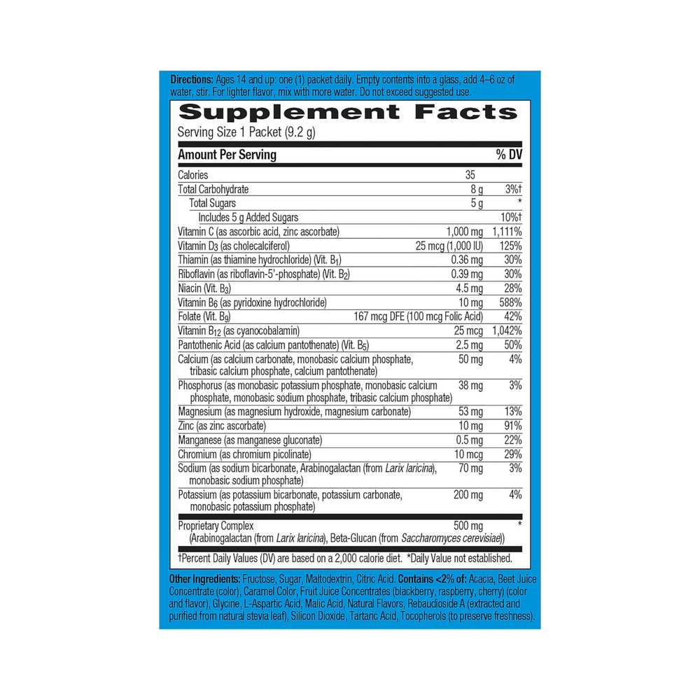 Ages 14 and up: one (1) packet daily. Empty contents into a glass, add 4–6 oz. of water, stir. For lighter flavor, mix with more water. Less water=more flavor.