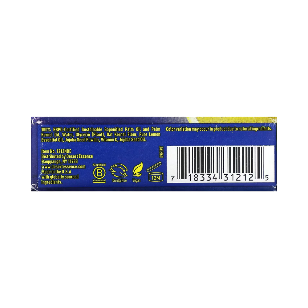 100% RSPO-Certified Sustainable Saponified Palm Oil and Palm Kernel Oil, Water, Glycerin, Oat Kernel Flour, Pure Lemon Essential Oil, Jojoba Seed Powder, Vitamin C, Jojoba Seed Oil