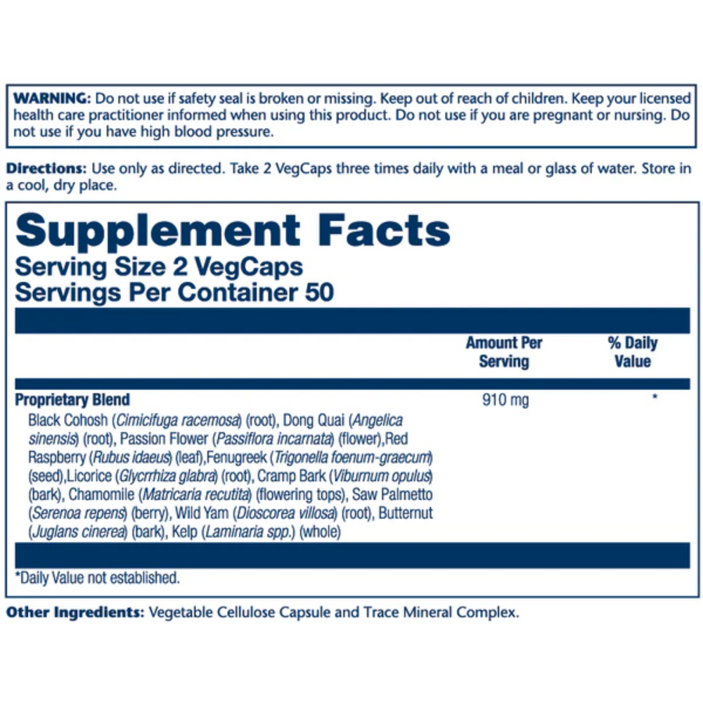 Proprietary Blend Black Cohosh (Cimicifuga racemosa) (root), Dong Quai (Angelica sinensis) (root), Passion Flower (Passiflora incarnata) (flower), Red Raspberry (Rubus idaeus) (leaf), Fenugreek (Trigonella foenum-graecum) (seed), Licorice (Glycrrhiza glabra) (root), Cramp Bark (Viburnum opulus) (bark), Chamomile (Matricaria recutita) (flowering tops), Saw Palmetto (Serenoa repens) (berry), Wild Yam (Dioscorea villosa) (root), Butternut (Juglans cinerea) (bark), Kelp (Laminaria spp.) (whole) |