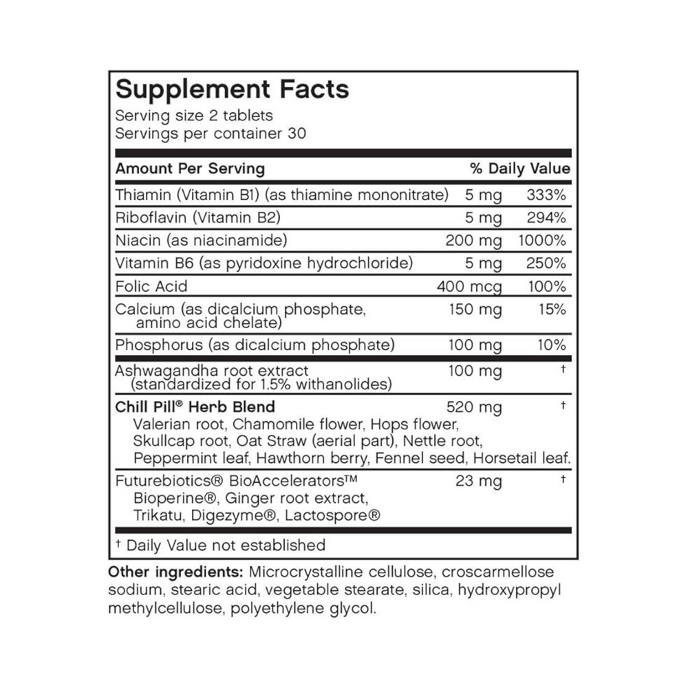 Chill Pill® is potency enhanced with Futurebiotics exclusive BioAccelerators™, including Lactospore® probiotics, for improved nutrient absorption and utilization.