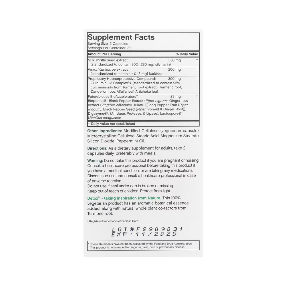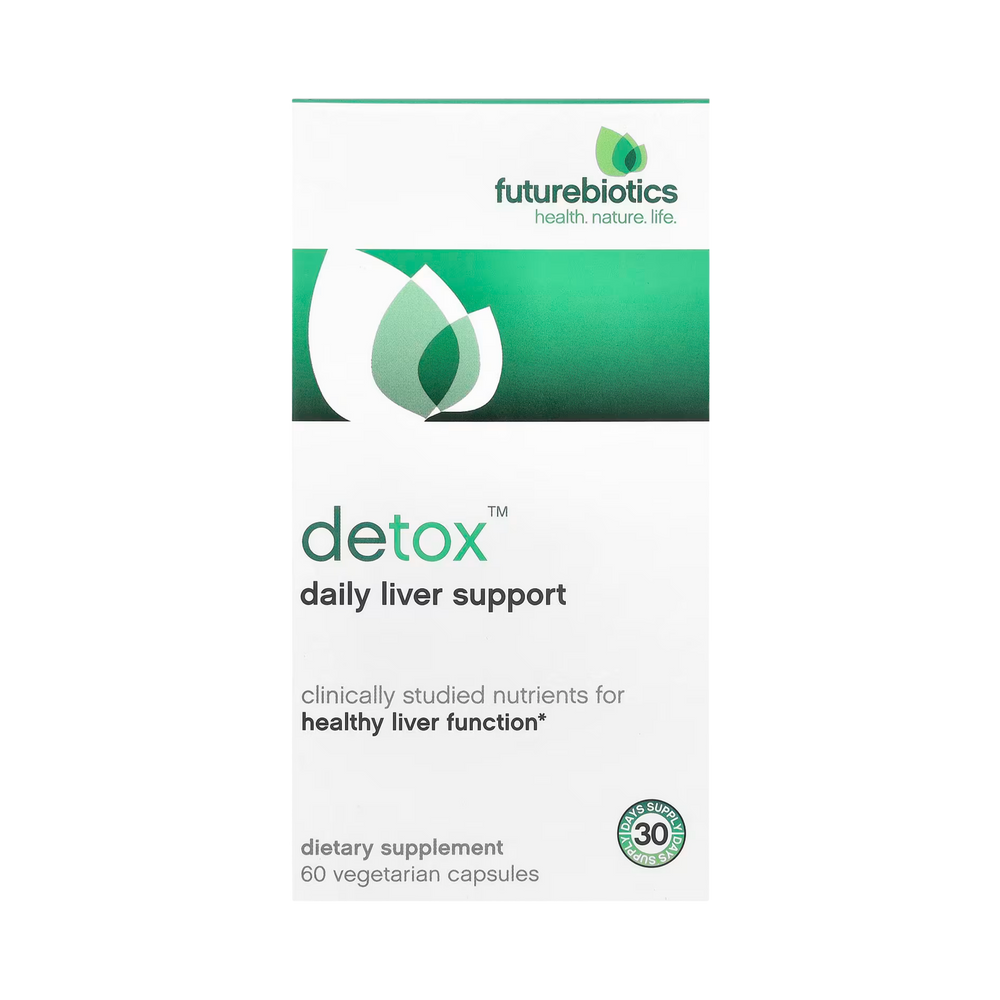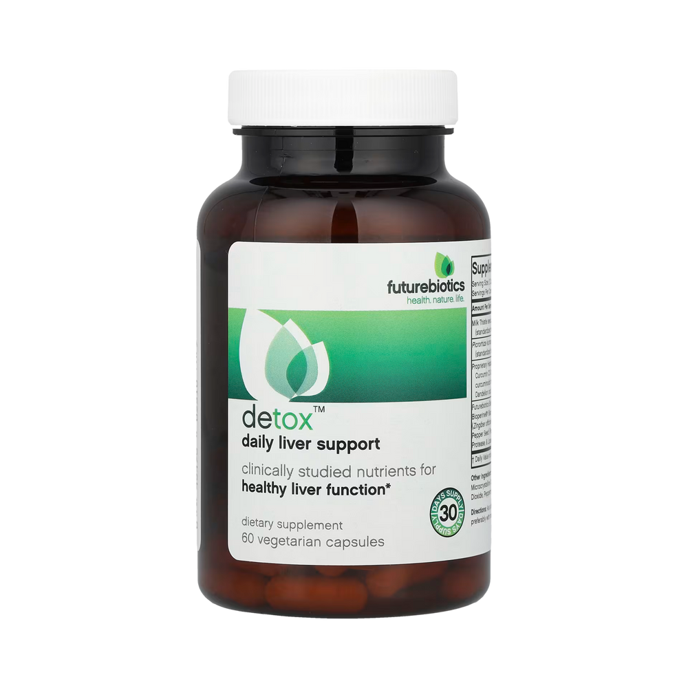 Clinical research has shown that the ingredients in Futurebiotics Detox™, including Milk Thistle extract, Picrorhiza kurroa extract, Artichoke leaf, and Turmeric extract all help support healthy liver function by protecting the liver, stimulating and regenerating liver cells, and providing antioxidant support.