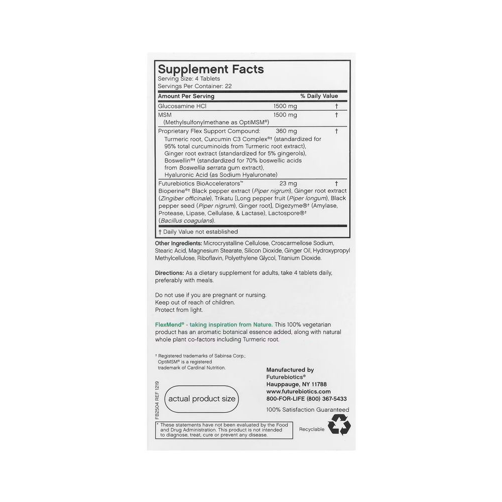 FlexMend® potency-enhanced with Futurebiotics Bioaccelerators™ Clinically-studied Bioperine+ (Piper nigrum extract) improves nutrient bioavailability, while our proprietary natural compound of Ginger extract, Trikatu, super-potent Digezyme® and LactoSporeⓇ boosts digestion
