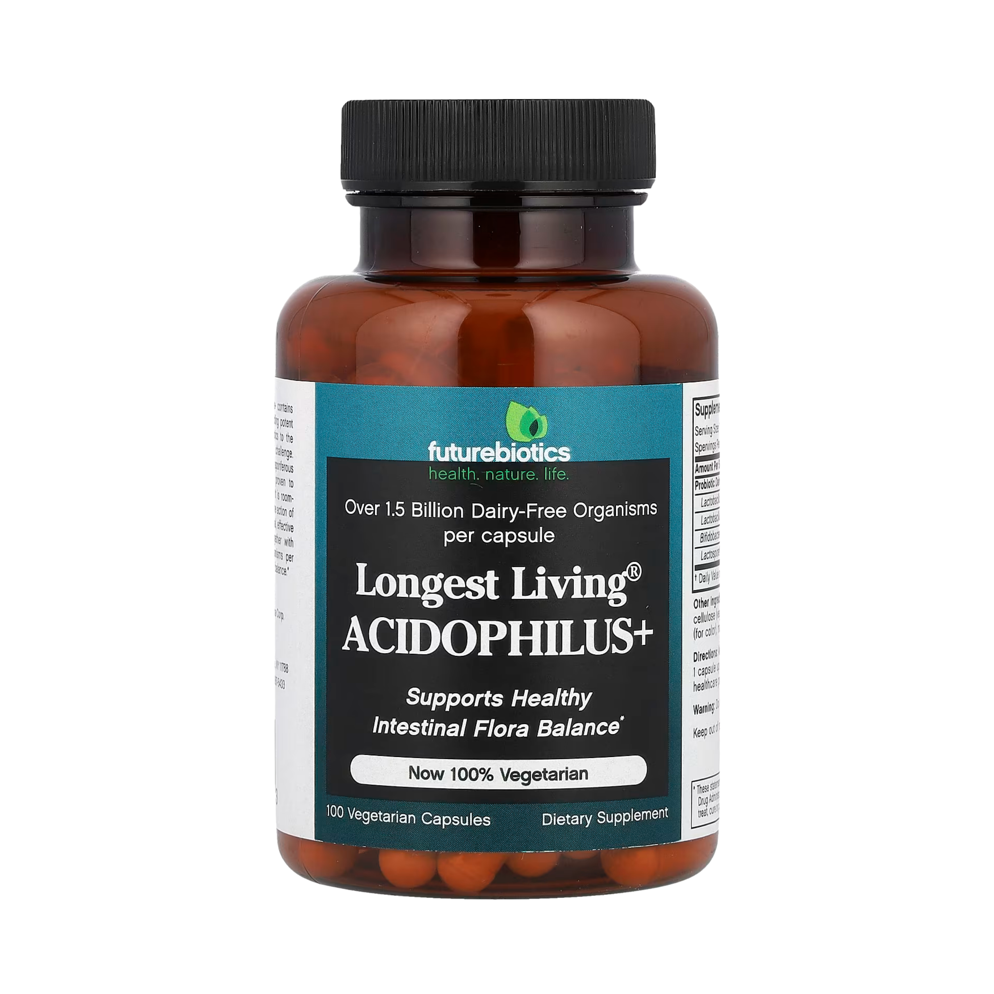 Futurebiotics® Longest Living® Acidophilus+ contains a unique blend of Lactobacilli strains, including potent Lactospore®. Delivering viable live probiotics to the intestinal tract is a formidable technical challenge. Lactospore® is a naturally microencapsulated sporiferous preparation of Bacillus coagulans that is proven to deliver viable Lactobacilli to the intestine. It is room- temperature stable and highly resistant to the action of heat, gastric acids and bile. Three additional, effective probiotic strains are included, which together with Lactospore® provides over 1.5 billion organisms per capsule and supports healthy intestinal flora balance.