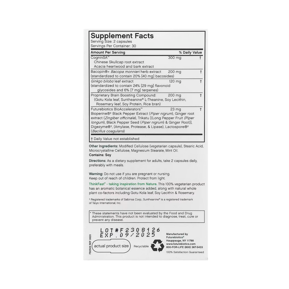 ThinkFast® - taking inspiration from Nature. This 100% vegetarian product has an aromatic botanical essence added, along with natural whole plant co-factors including Gotu Kola leaf, Soy Lecithin & Rosemary.