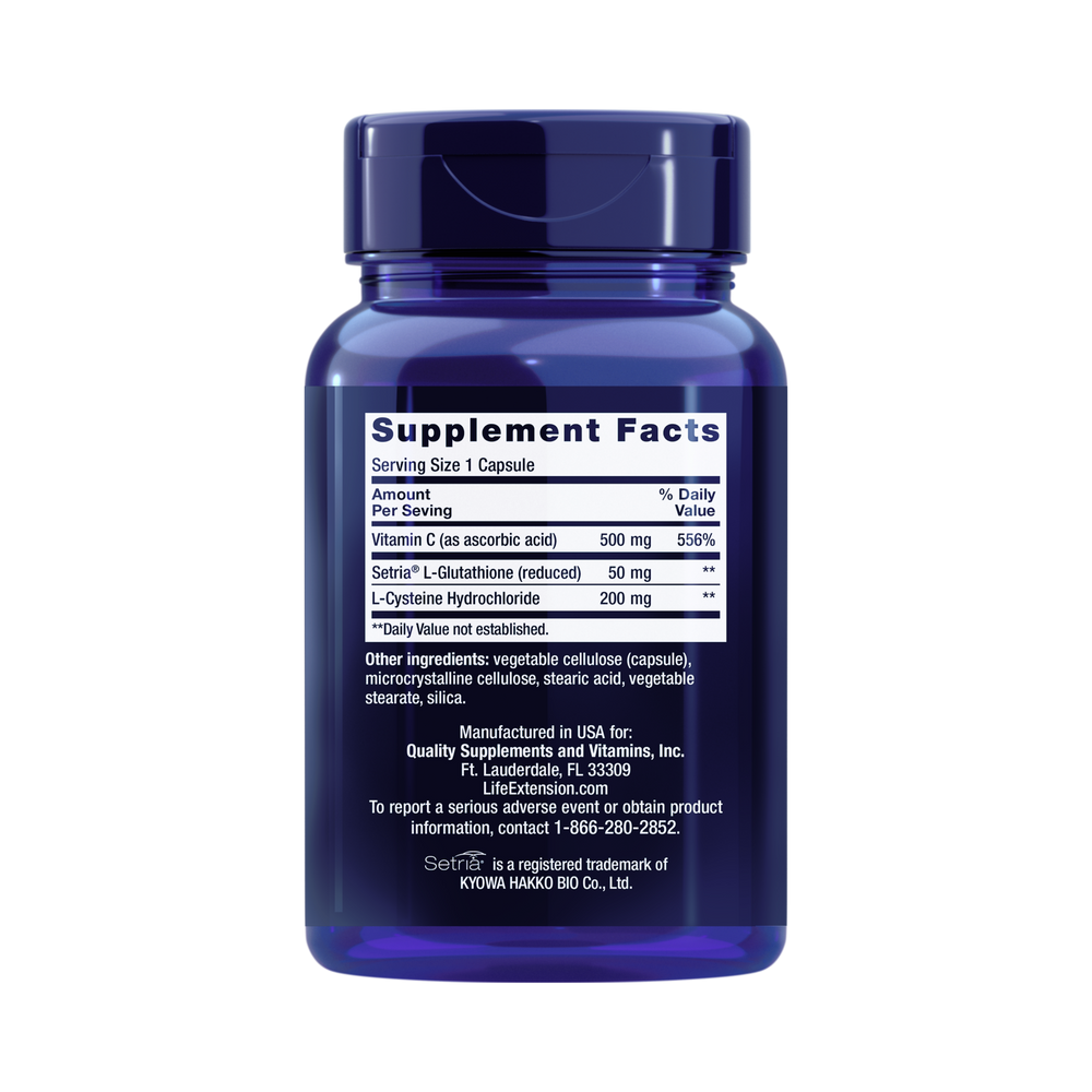 Our formula features L-cysteine, a non-essential amino acid with many health benefits ranging from protein synthesis to glutathione production. It also has vitamin C and additional glutathione to help protect your cells from oxidative stress, scavenge free radicals, support healthy iron absorption and more.