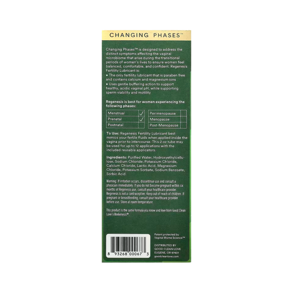 Changing Phases™ is designed to address the distinct symptoms affecting the vaginal microbiome that arise during the transitional periods of women's lives to ensure women feel balanced, comfortable, and confident. Regenesis Fertility Lubricant is: