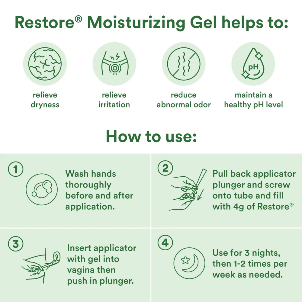 Use one application as needed for day-to-day comfort and moisture. Restore® can also be used for personal lubrication to enhance intimate sexual activity and supplement the body's natural lubrication. Compatible with natural latex and polyisoprene condoms.