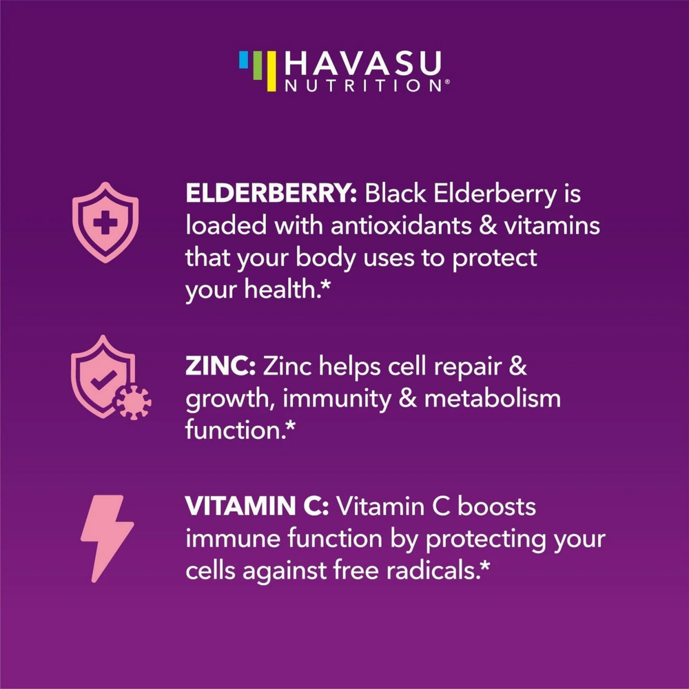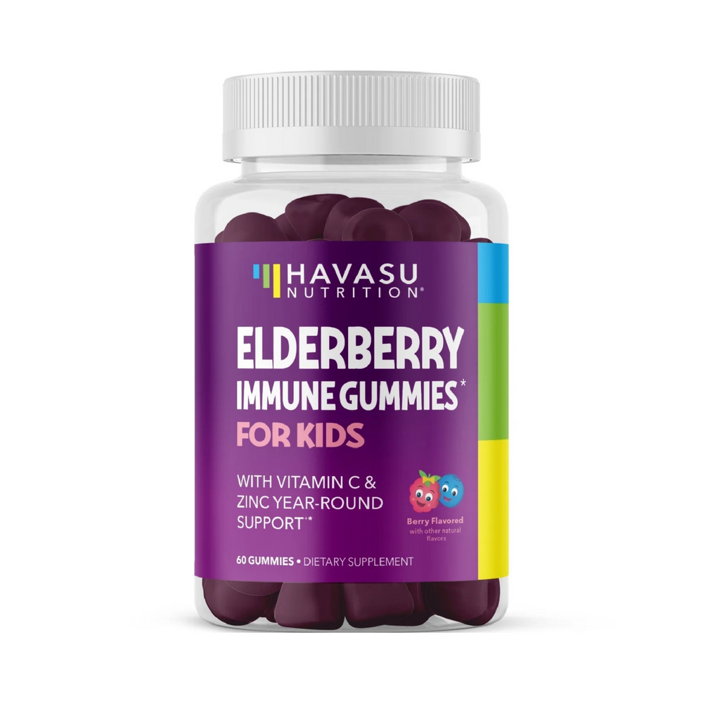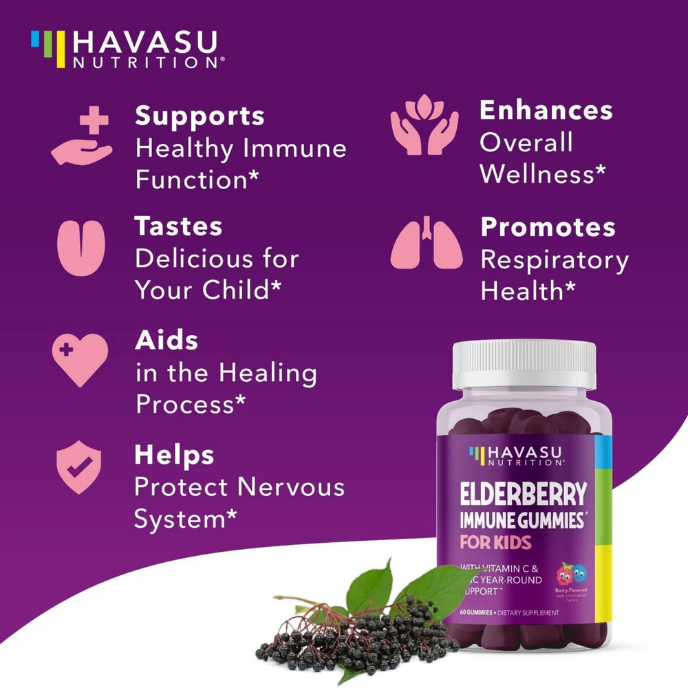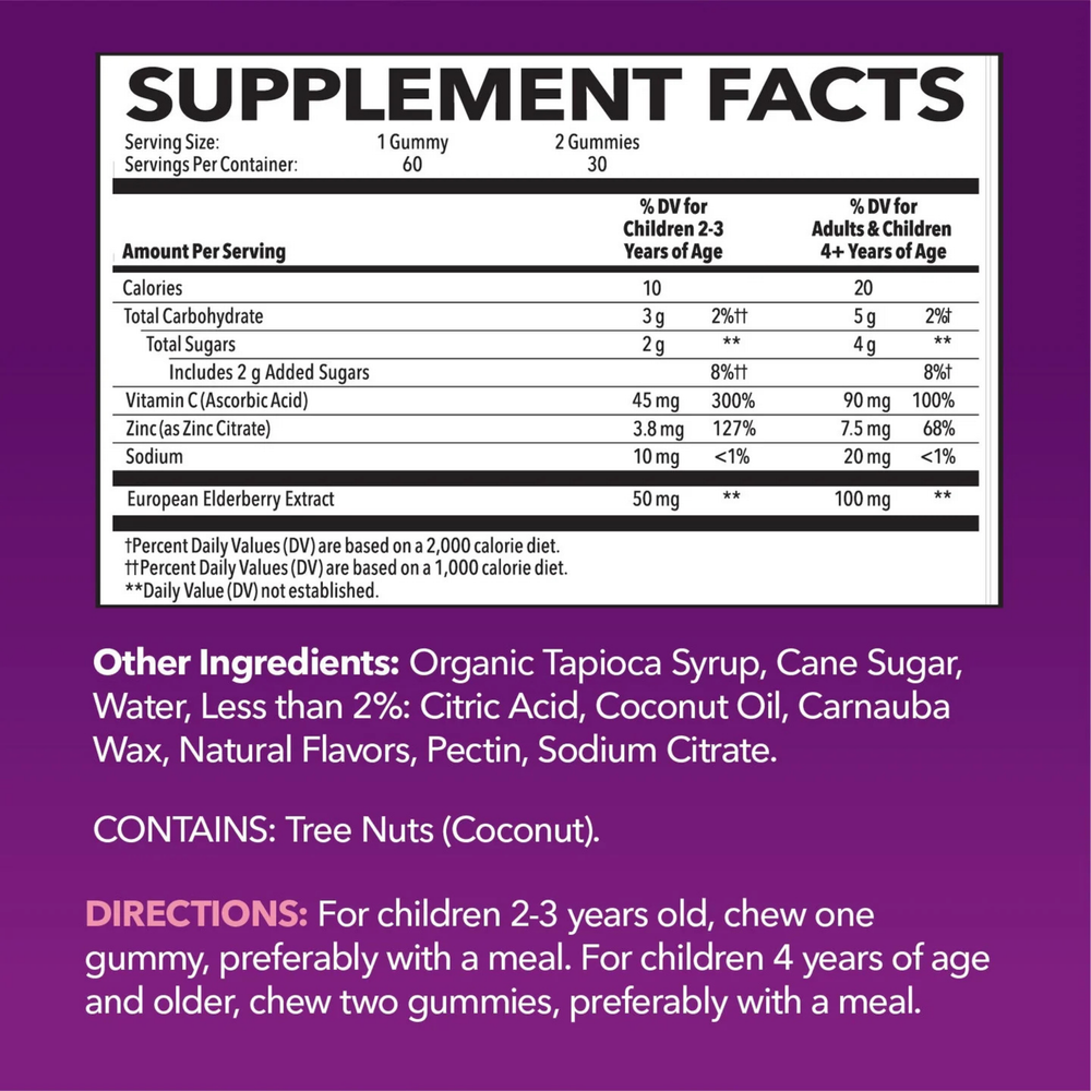 Triple Immune Support. These tasty Elderberry gummies are carefully created for children 2 and above for year-round immune support. The premium immunity blend includes European Elderberry Extract, Vitamin C and Zinc in a pectin-based gummy for a healthy dose each day, giving your child additional protection.