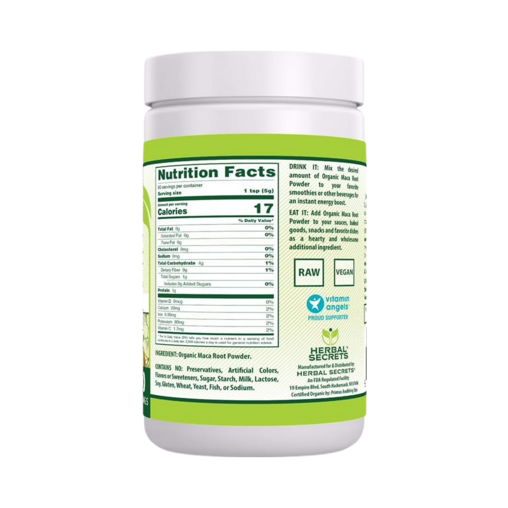 Herbal Secrets Maca root powder is made with organically grown Maca. You can mix it with smoothies, yogurts, sauces, baked dishes etc. It is free of artificial fillers or chemicals making is easy to incorporate this amazing root into your diet. This product is organic certified by the USDA