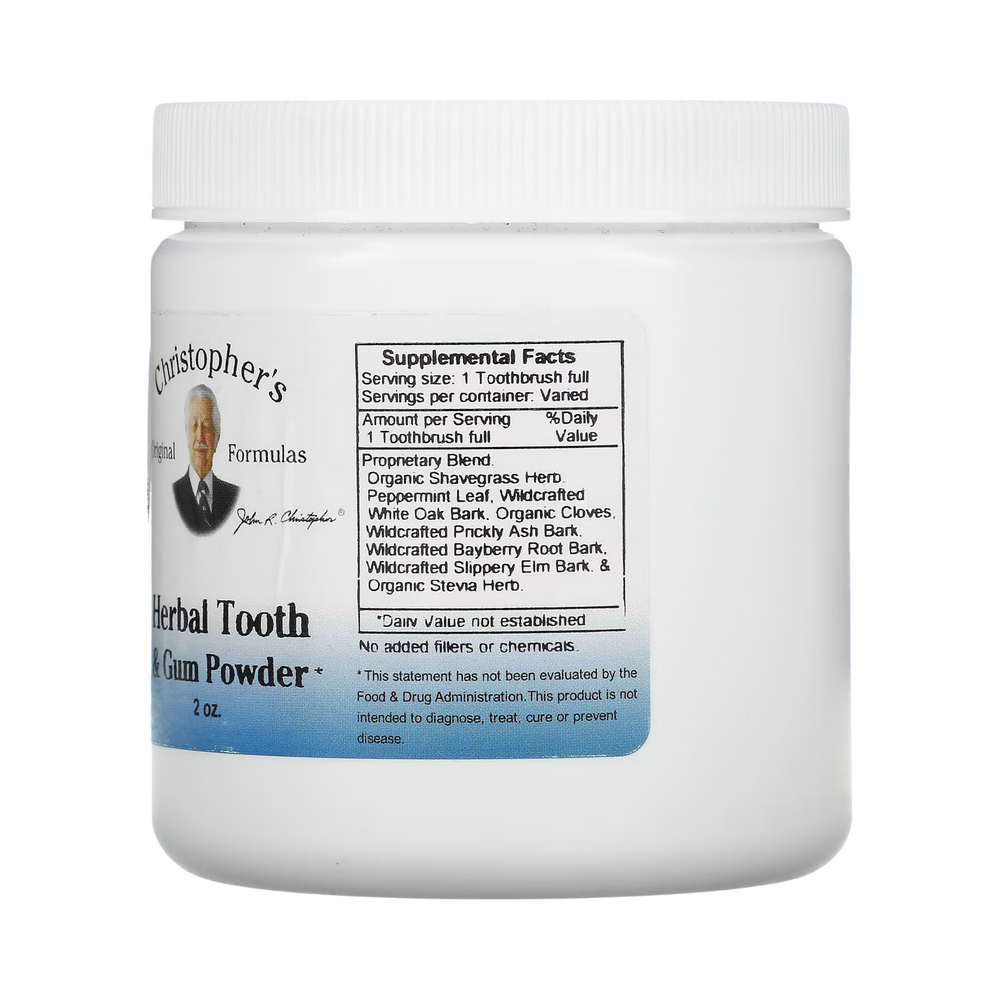 Dr. Christopher's Herbal Tooth & Gum Powder aids in strengthening gums, assists in tightening loose teeth & brightens the teeth luster.