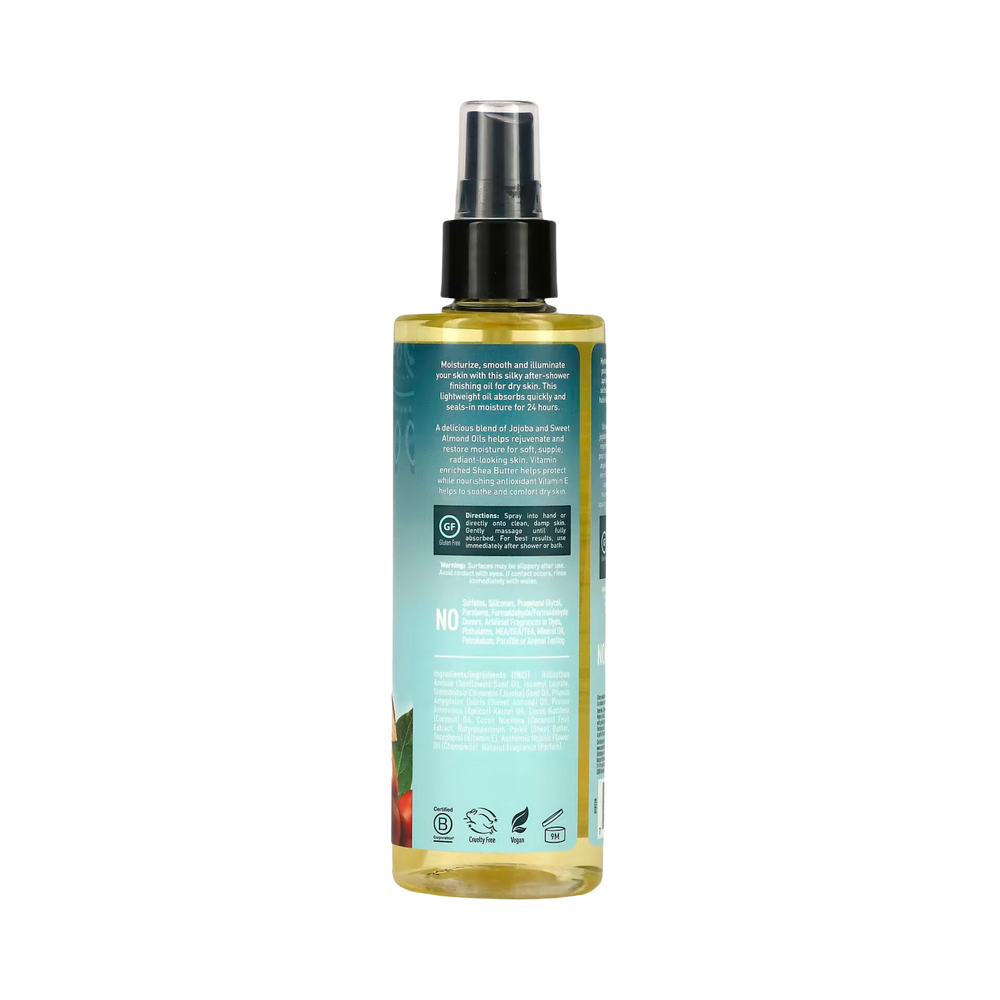 Deeply moisturizing after-shower finishing body oil spray formulated with Jojoba Oil, Almond Oil and SheaButter. Perfect for dry skin, this illuminating blend absorbs quickly and seals in moisture for 24 hours.