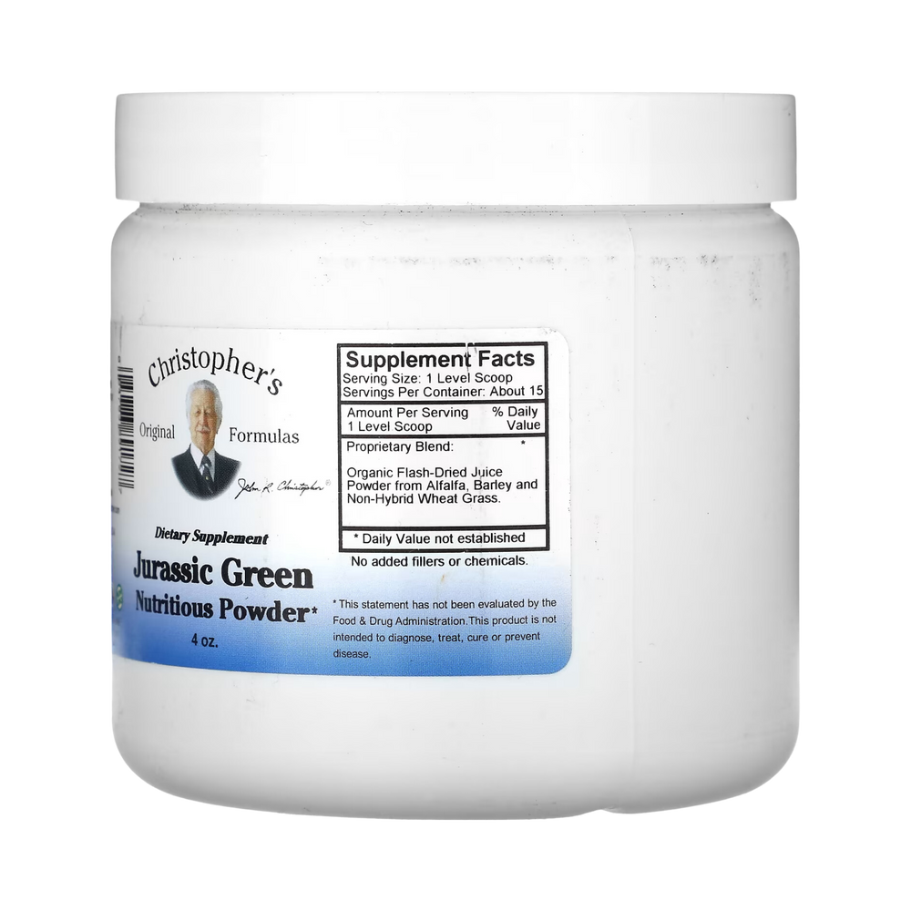 Dr. Christopher's Jurassic Green Powder is packed full of phyto-nutrients, whole food vitamins, trace minerals, active enzymes, chlorophyll, balanced amino acids & other important nutrients needed by the body.