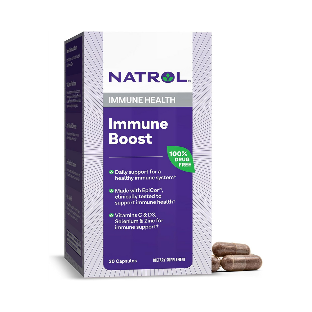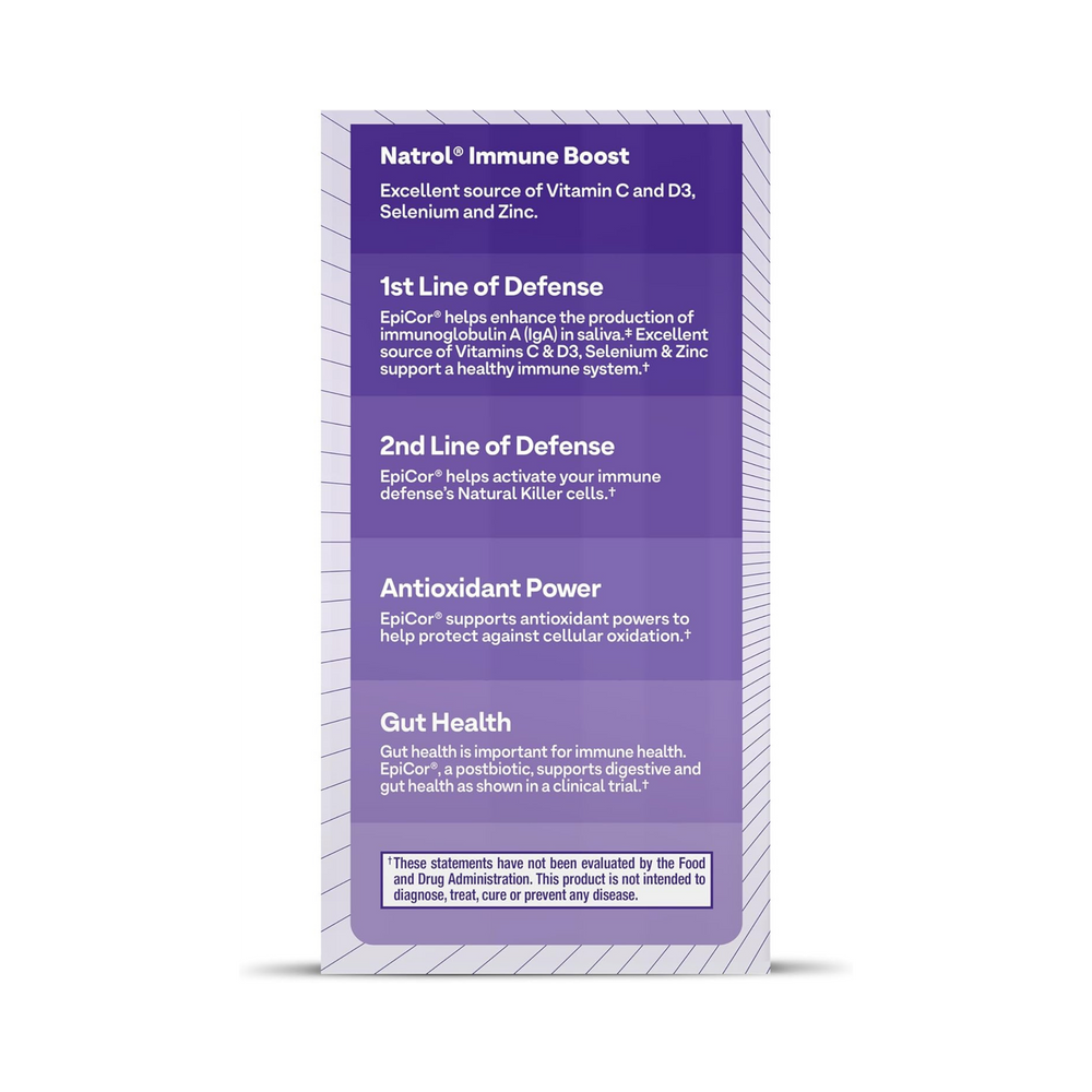 Natrol Immune Boost is an advanced formula that features EpiCor, the immune-promoting yeast complex. EpiCor has been clinically shown to promote immune function by enhancing the activity of immune cells. Just some of the benefits of Natrol Immune Boost include featuring EpiCor Super Food - clinically shown to help your body activate and guard immune function. EpiCor also helps activate the Body's Natural Killer (NK) Cells, a type of highly specialized white blood cells that are one of the body's primary lines of immune defense. Natrol Immune Boost also provides Key Vitamins (C & D3), Selenium, and Zinc for optimal immune function. Adults take 1 capsule, one time daily, with a meal. For Children 9 years and older sprinkle the contents of 1 capsule, once daily, into their favorite food. Not recommended for children under 9 years old. Natrol makes this product in the U.S.A.!