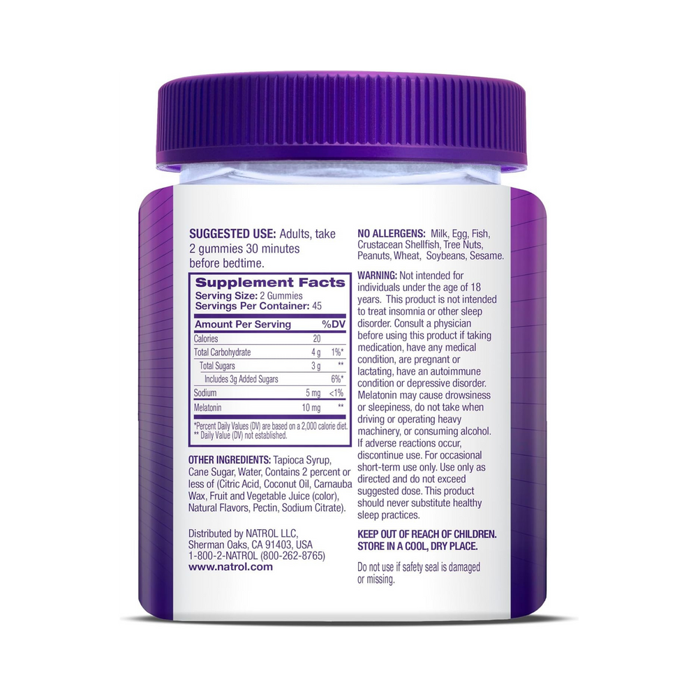 WARNING: Not intended for individuals under the age of 18 years. This product is not intended to treat insomnia or other sleep disorder. Consult a physician before using this product if taking medication, have any medical condition, are pregnant or lactating, have an autoimmune condition or depressive disorder. Melatonin may cause drowsiness or sleepiness, do not take when driving or operating heavy machinery, or consuming alcohol. If adverse reactions occur, discontinue use. For occasional short-term use only. Use only as directed and do not exceed suggested dose. This product should never substitute healthy sleep practices. STORE IN A COOL, DRY PLACE. KEEP OUT OF REACH OF CHILDREN.
