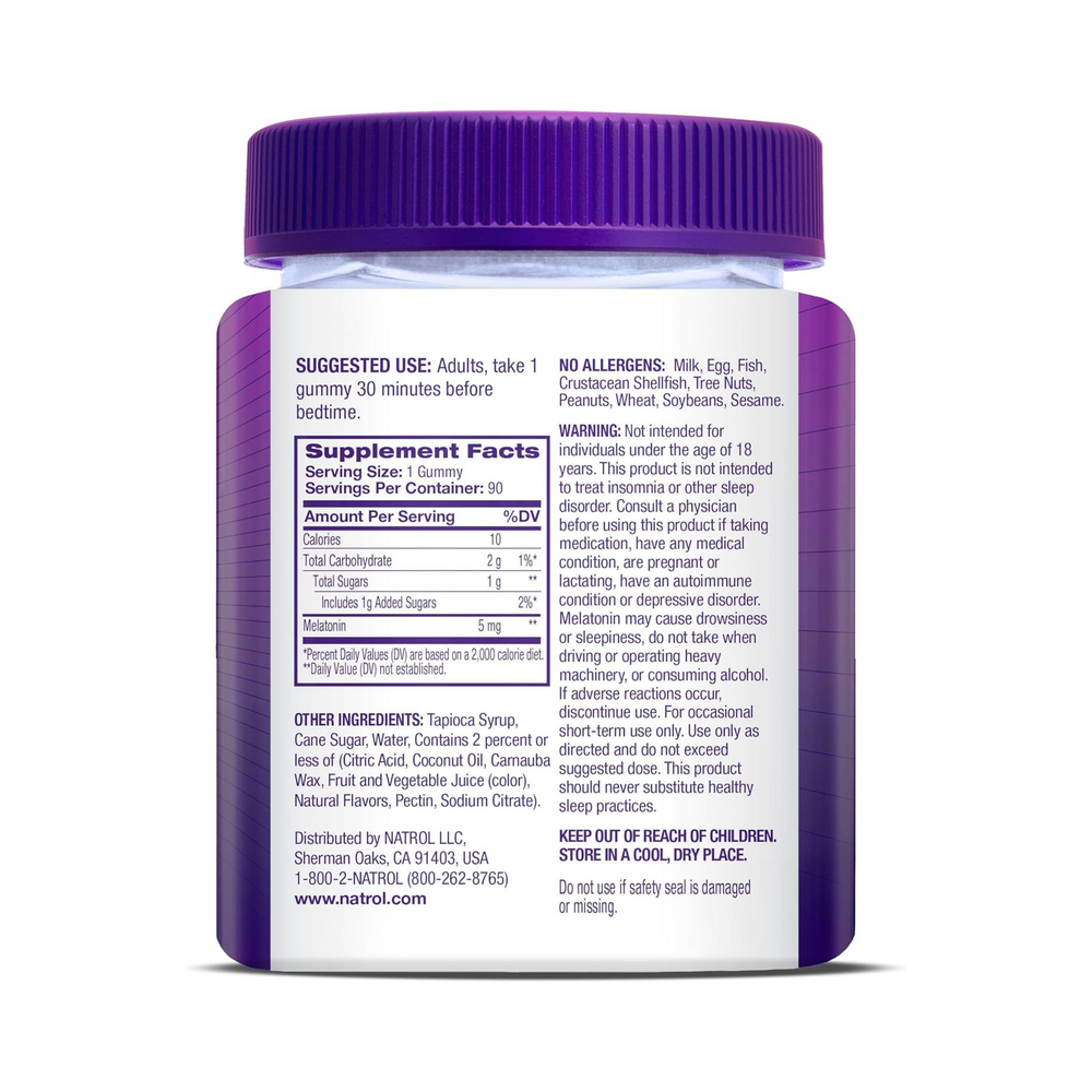 Dietary Ingredients: Melatonin, Sodium. Other Ingredients: Organic Tapioca Syrup, Organic Cane Sugar, Water, Contains 2 percent or less of (Citric Acid, Coconut Oil, Carnauba Wax, Fruit and Vegetable Juice (for color), Natural Flavors, Pectin, Sodium Citrate).