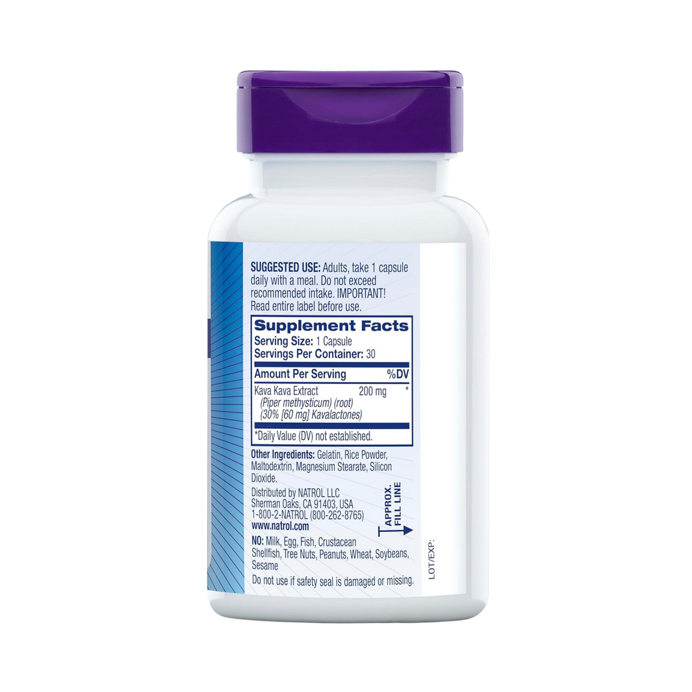Dietary Ingredients: Kava Kava Extract (Piper methysticum) (root), Kavalactones 30%. Other Ingredients: Gelatin, Silicon Dioxide, Rice Powder, Magnesium Stearate, Maltodextrin.