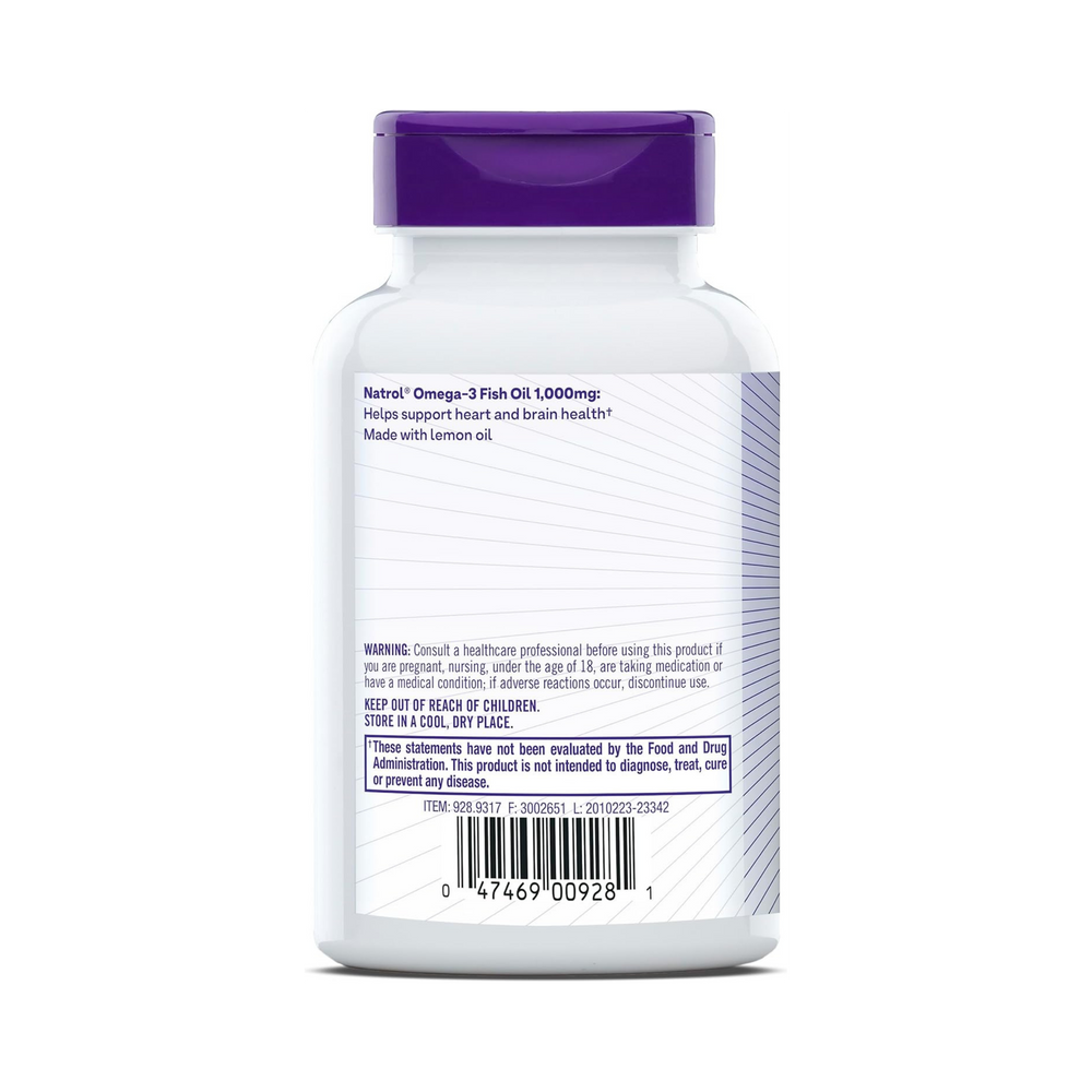 Omega 3 Fish Oil from Natrol includes natural lemon oil for great tasting lemon flavor. It delivers 180 mg EPA and 120 mg DHA to support heart, eye and bone health. No milk, egg, crustacean shellfish, tree nuts, peanuts, wheat, yeast, artificial colors or flavors or added sugar.