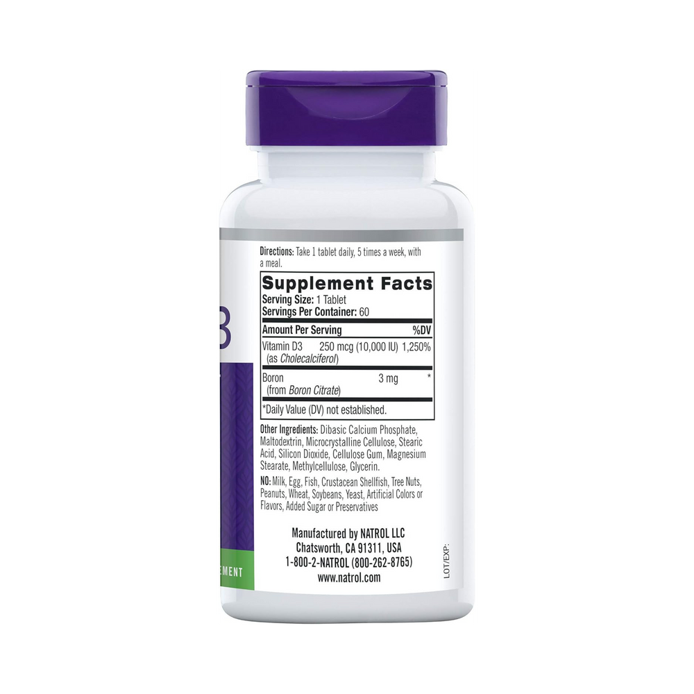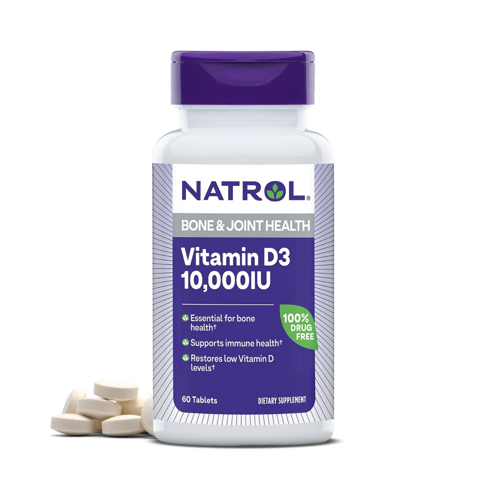 Natrol Vitamin D3 10,000 IU tablets offer a dietary supplement option for immune support, bone health, and for restoring low vitamin D3 levels(1). Made with quality ingredients, this dietary supplement is a 100% drug free immune support supplement with no common food allergens. Adults, take one tablet daily with a meal. Natrol is committed to creating innovative, quality products to support your health and well-being in your busy, modern lifestyle. (1)These statements have not been evaluated by the Food and Drug Administration. This product is not intended to diagnose, treat, cure or prevent any disease.