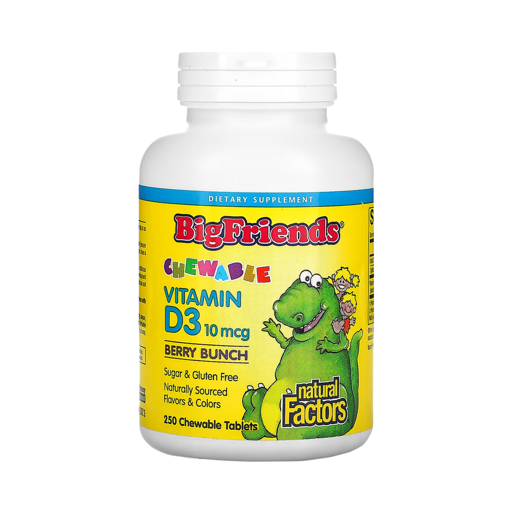Big Friends Chewable Vitamin D3 is a convenient 10 mcg (400 IU) tablet in a delicious berry bunch flavor. A factor in maintenance of good health. Helps in the development and maintenance of bones and teeth. Helps in the absorption and use of calcium and phosphorus. Helps to prevent vitamin D deficiency.