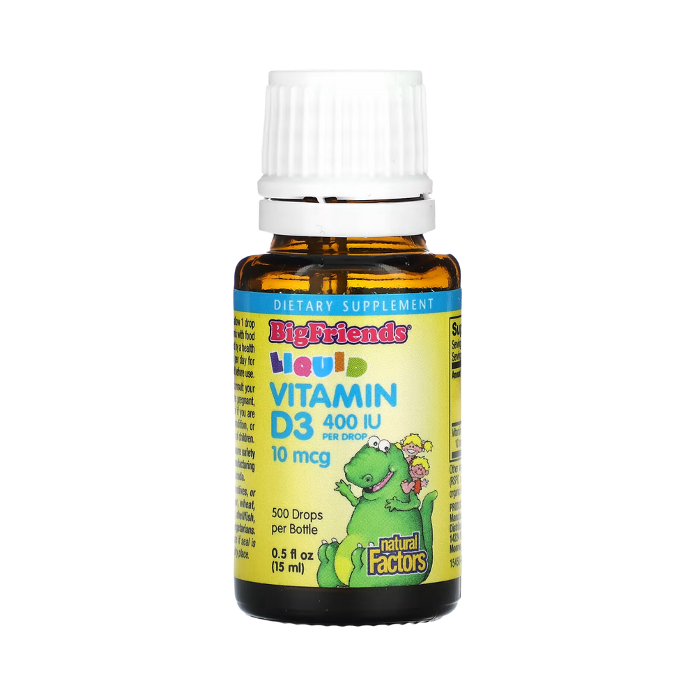Big Friends Liquid Vitamin D3 is carefully blended in a mixture of medium chain triglycerides (sourced from certified sustainable palm and coconut oil) and flaxseed oil providing 10 mcg (400 IU) of vitamin D3 in just one little drop. Vitamin D3 is essential for strong bones and teeth as it increases the body's absorption of calcium from food. Its role in regulating calcium levels also helps regulate the immune system and maintain healthy nerves and muscles.