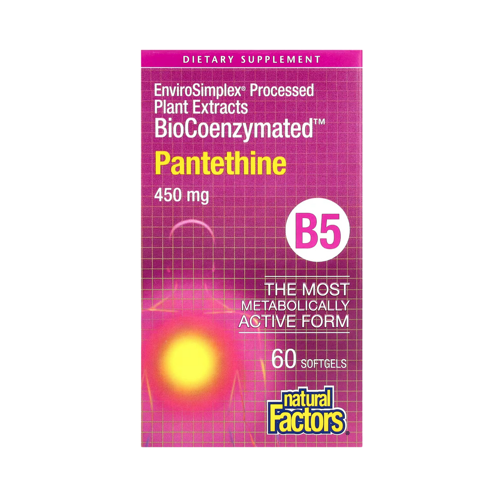 Pantothenic acid (vitamin B5) is an essential nutrient used in the synthesis of coenzyme A (CoA), a cofactor in many metabolic pathways. CoA is important for carbohydrate, lipid, protein, and energy metabolism. Pantethine is the coenzyme form of vitamin B5. Taking Pantethine allows for greater absorption and bioavailability than non-coenzyme forms. Pantethine helps support healthy serum lipid levels and is important for healthy cardiovascular function through its antioxidant activity. Natural Factors uses branded Pantesin®, a high-quality pharmaceutical-grade form of pantethine.