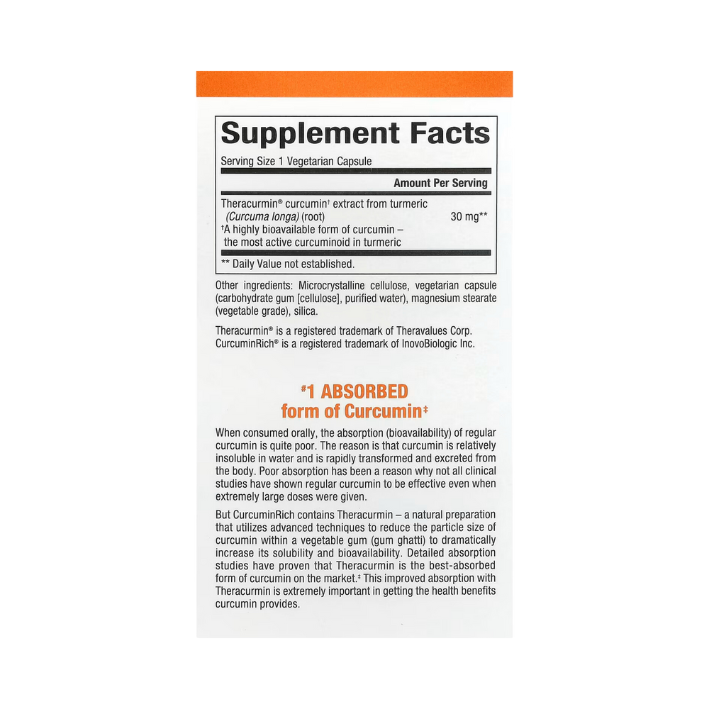 But CurcuminRich contains Theracurmin - a natural preparation that utilizes advanced techniques to reduce the particle size of curcumin within a vegetable gum (gum ghatti) to dramatically increase its solubility and bioavailability. Detailed absorption studies have proven that Theracurmin is the best-absorbed form of curcumin on the market.‡ This improved absorption with Theracurmin is extremely important in getting the health benefits curcumin provides.
